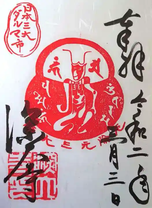 真ん中に梵字と角大師(つのだいし)がデザインされた達磨のイラストと厄除元三大師の文字が入った印、左上に日本三大ダルマ市の印、左下に深大寺の文字、深大寺印が押されています。