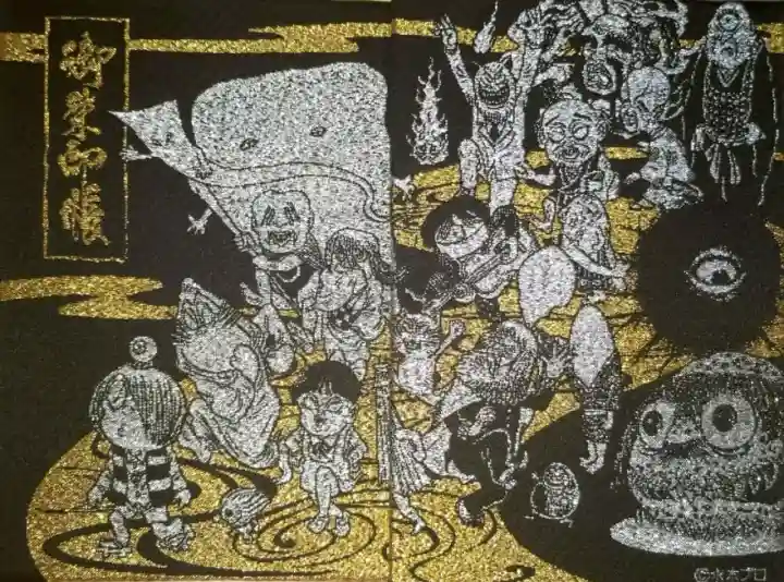 黒色の地に、ゲゲゲの鬼太郎のキャラクターが金色と銀色で刺繍された御朱印帳で、表面左上に御朱印帳の文字が入っています。