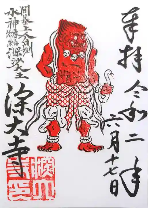 真ん中に深沙大王のイラストが入り、左上に「開基上人自刻 水神縁結深沙大王」の文字、左下に深大寺の文字、深大寺印が押されています。