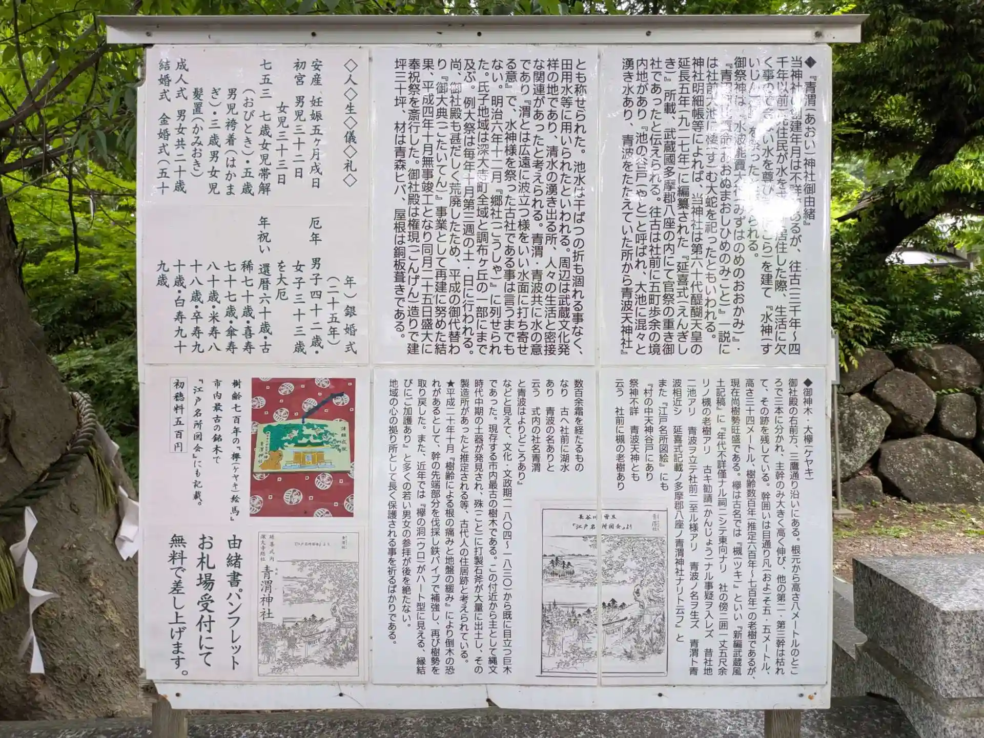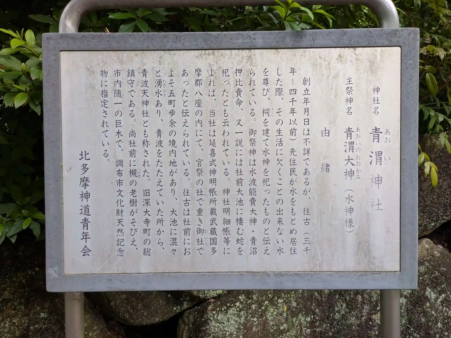 御祭神は青渭大神(あおいのおおかみ)・水波能売大神(みずはのめのおおかみ)・青沼押比売命(あおぬまおしひめのみこと)という水神様。(青渭神社のHPより)