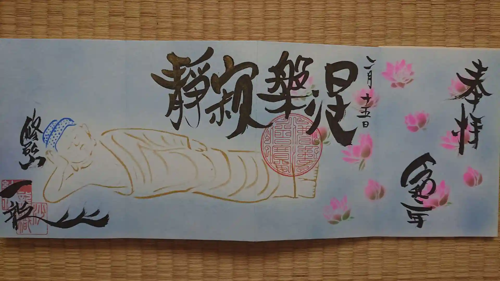 調布仙川の一龍院にてお釈迦様入滅の涅槃の四面アート御朱印を戴きました。