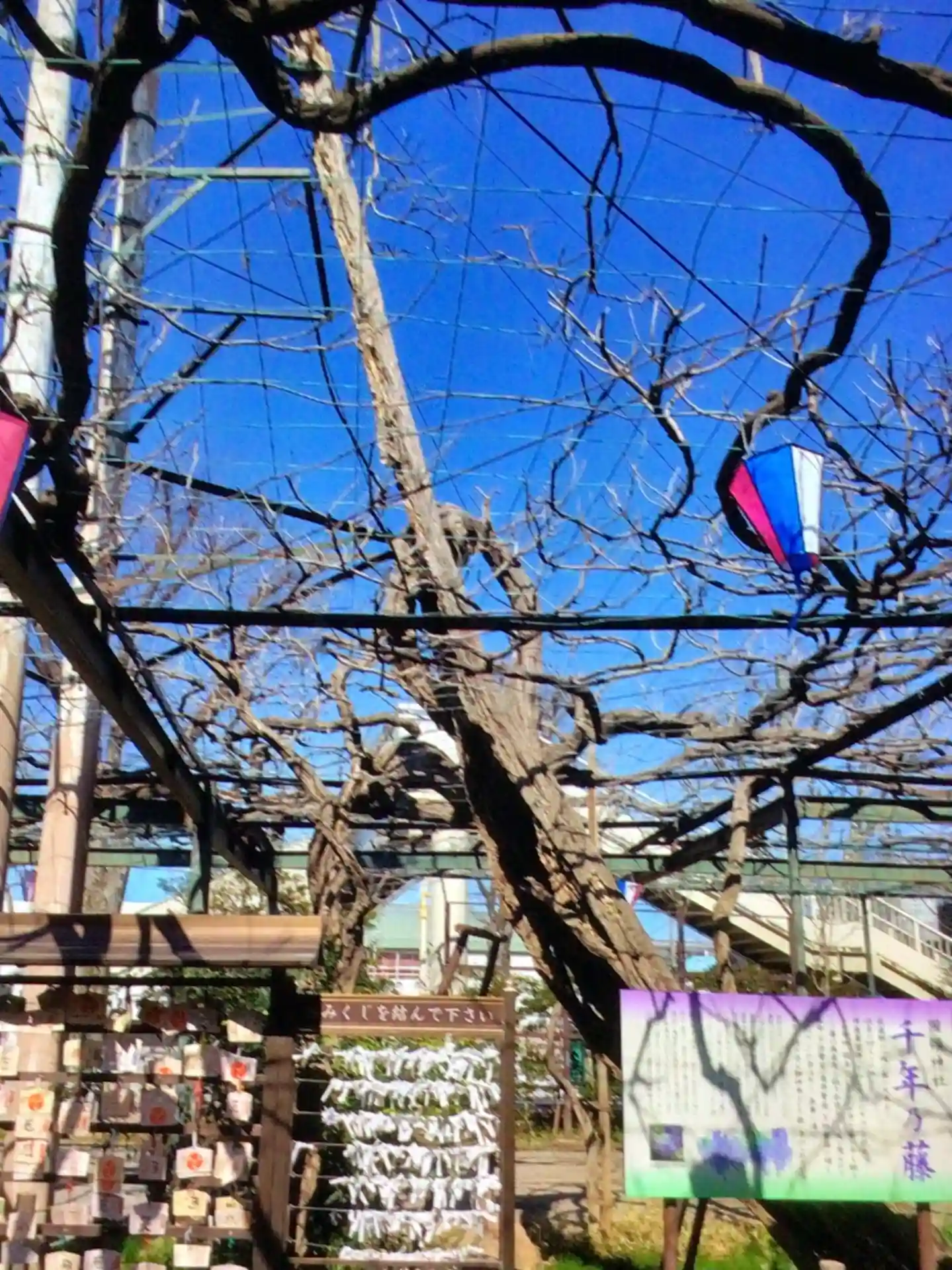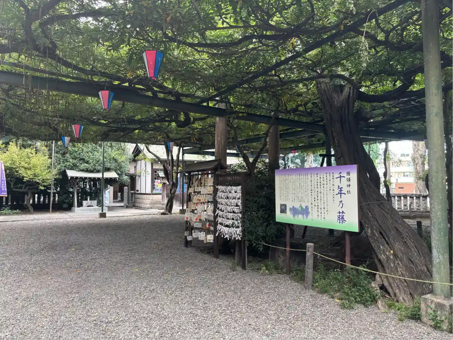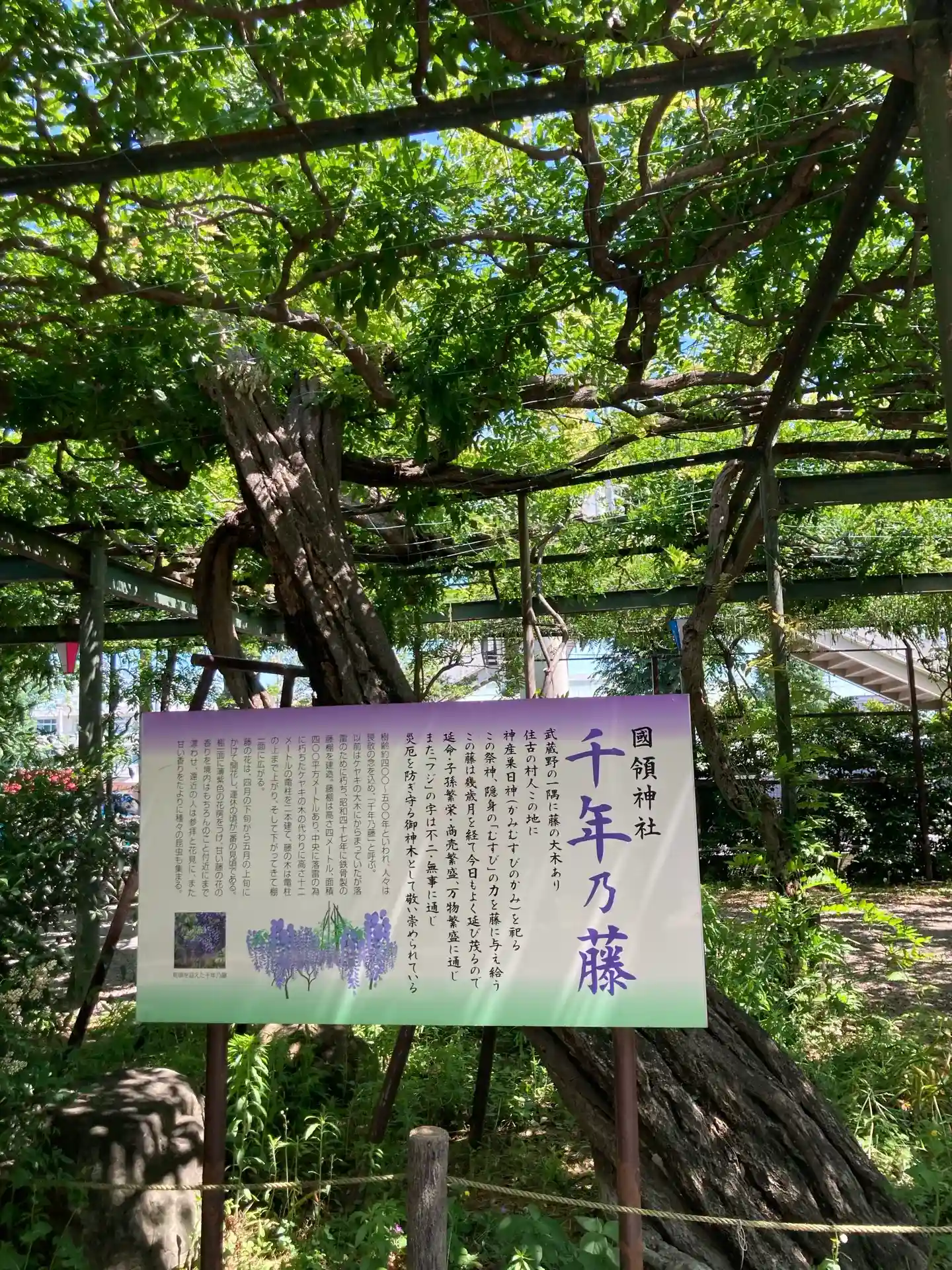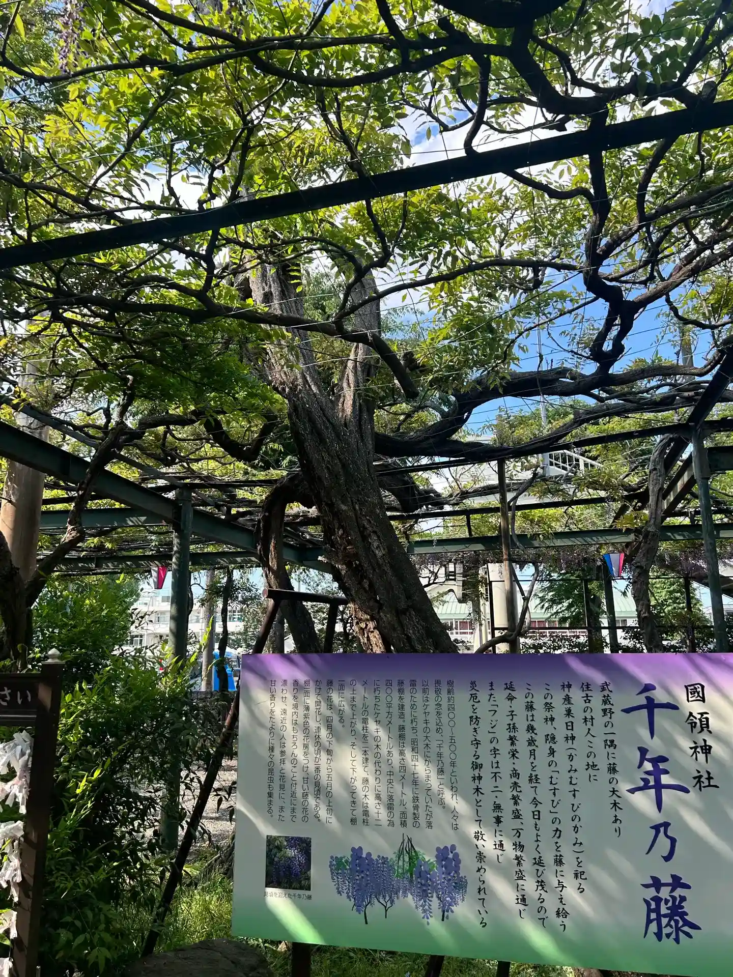 調布国領の「千年乃藤」を御神木とする国領神社。藤の時期はすでに終わっていましたが、大きな枝が藤棚に…