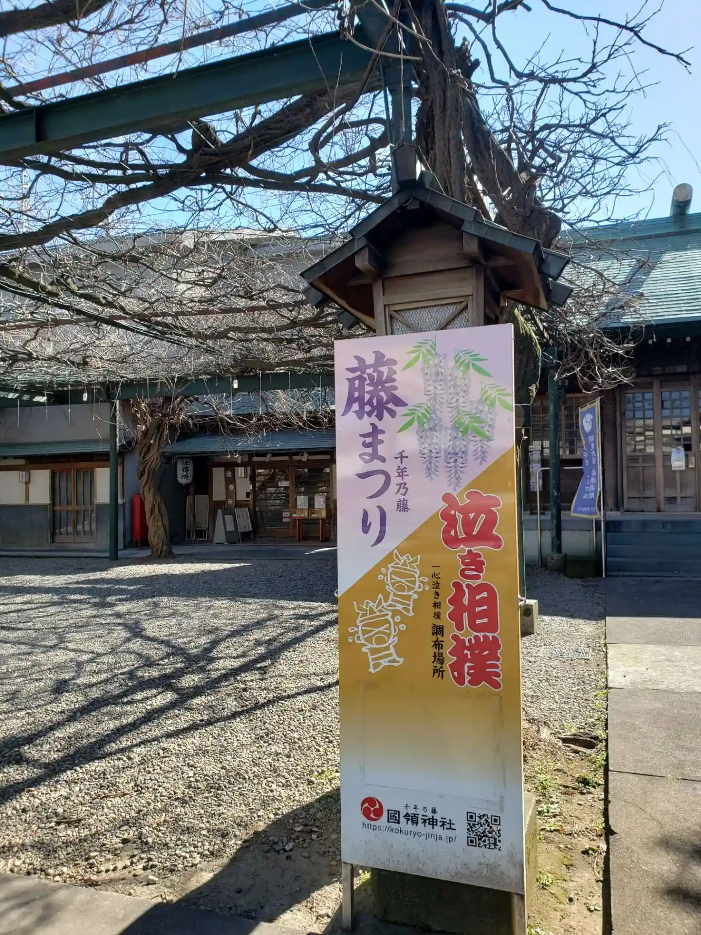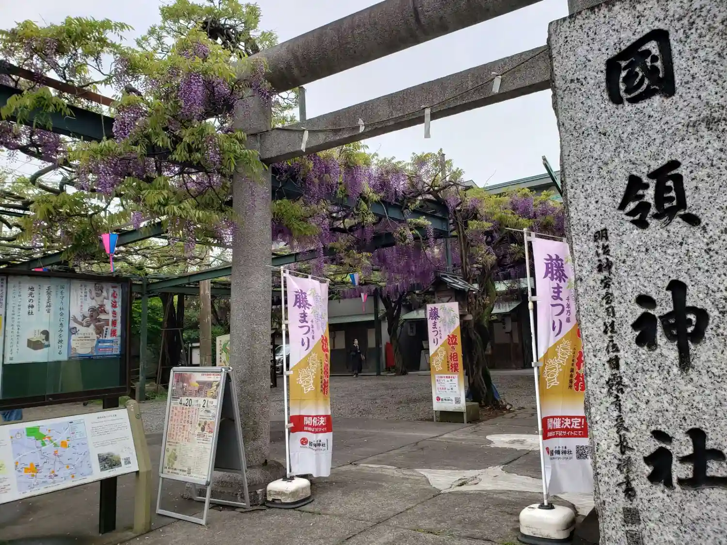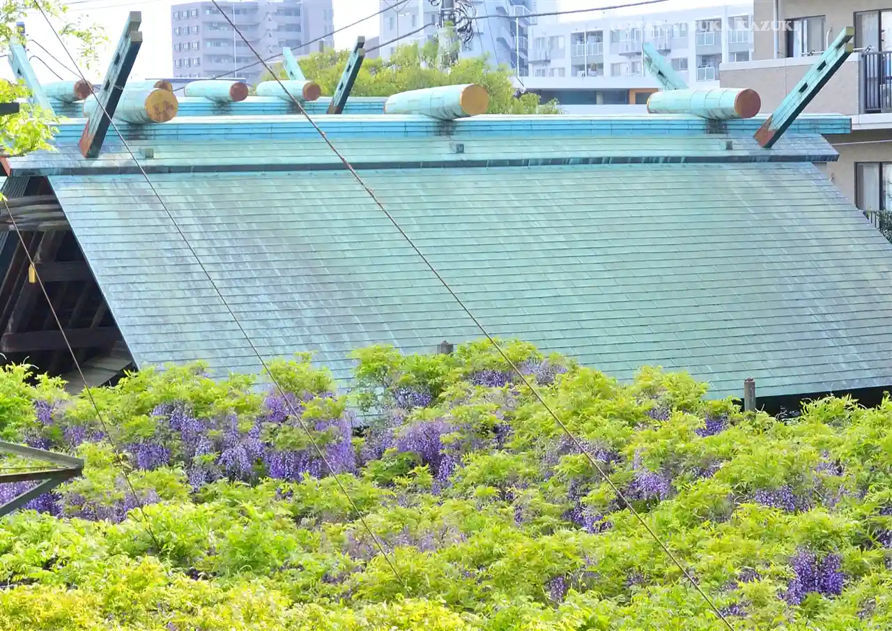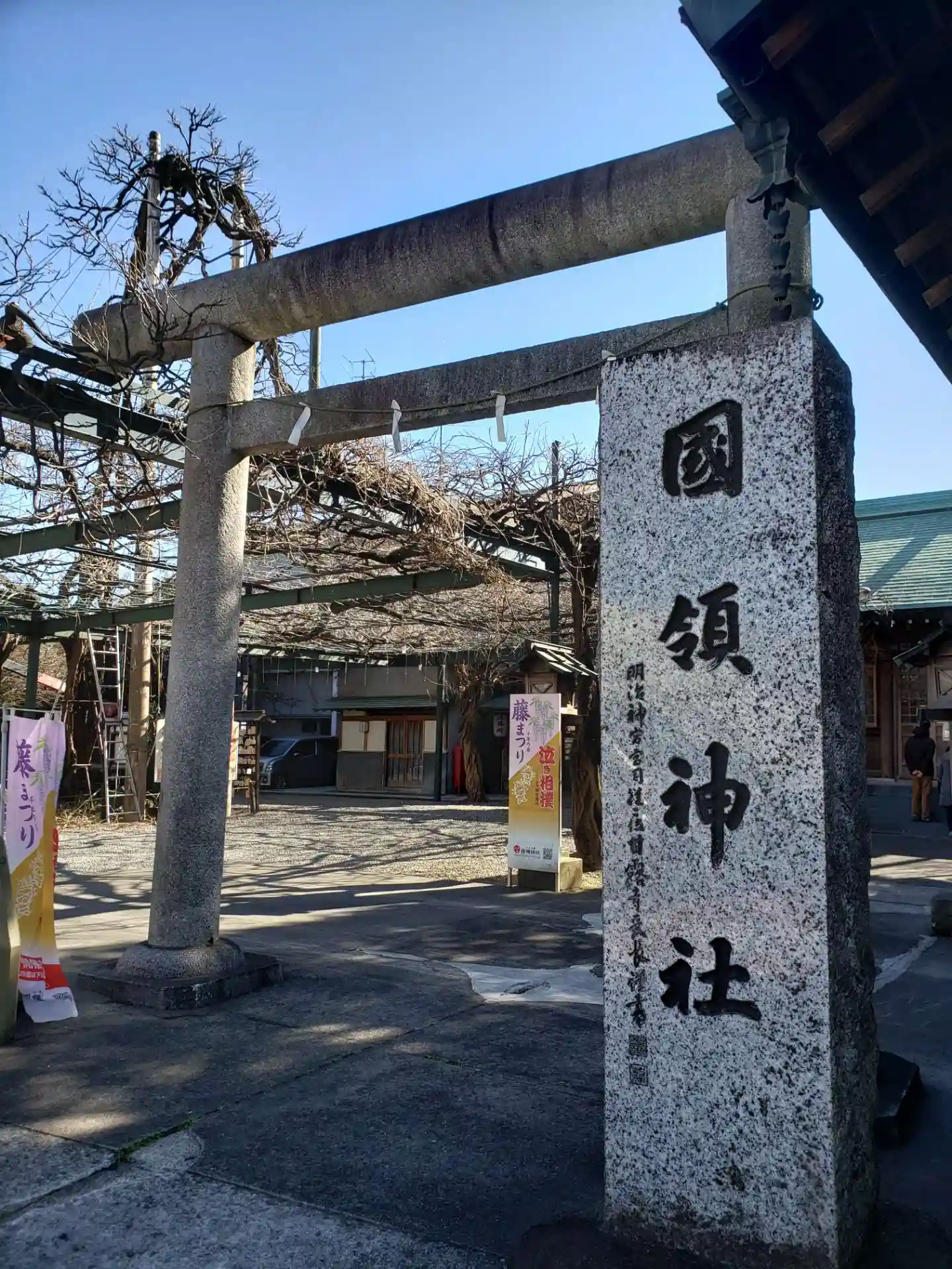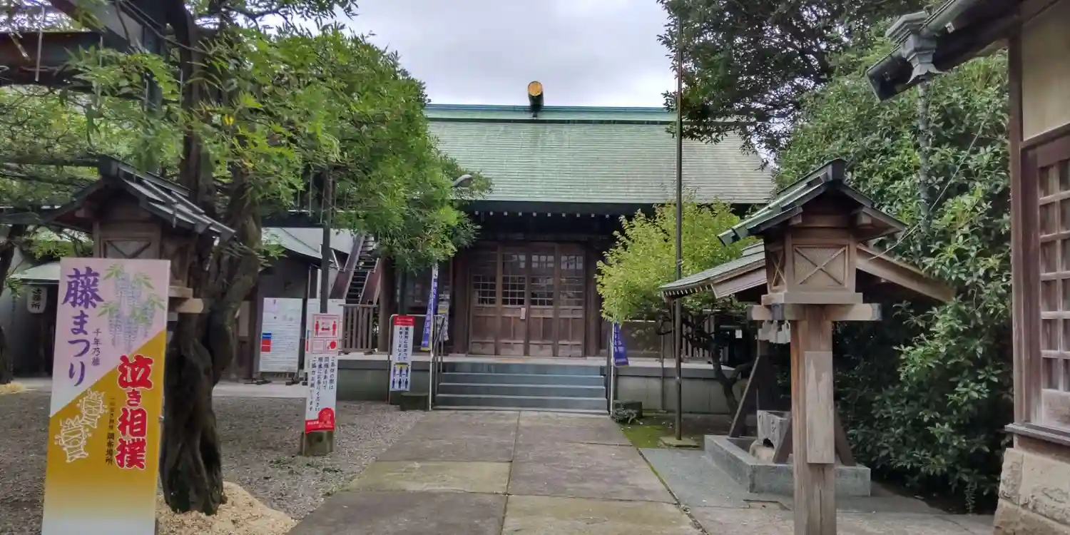 調布国領の「千年乃藤」を御神木とする国領神社。藤の時期はすでに終わっていましたが、大きな枝が藤棚に…