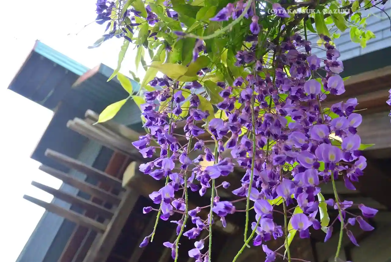 樹齢1000年の藤があり、春に藤棚に咲くのを楽しみにしています。