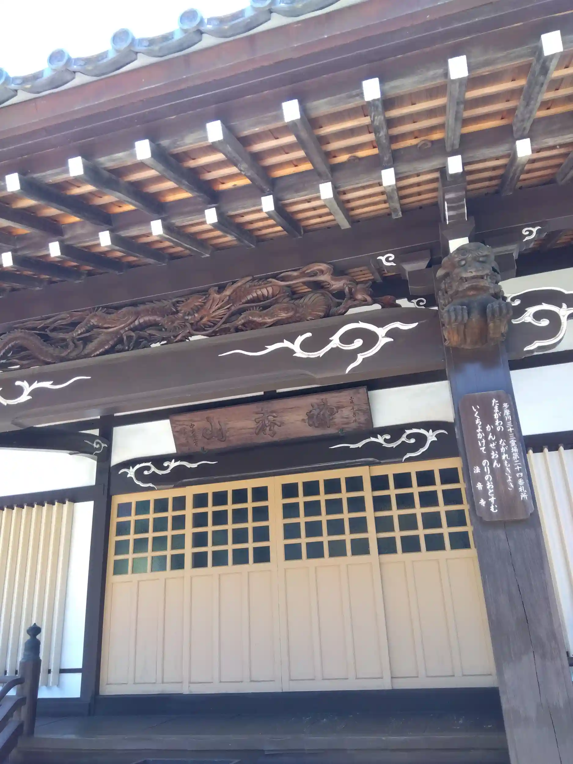 法音寺は府中市住吉町にある真言宗豊山派の寺院で神秀山と号します。本尊は阿弥陀如来で、創建年代は不詳だそうです。多摩川三十三ヶ所観音霊場24番、多摩八十八ヶ所霊場18番です。鎌倉街道は法音寺の前を通っています。