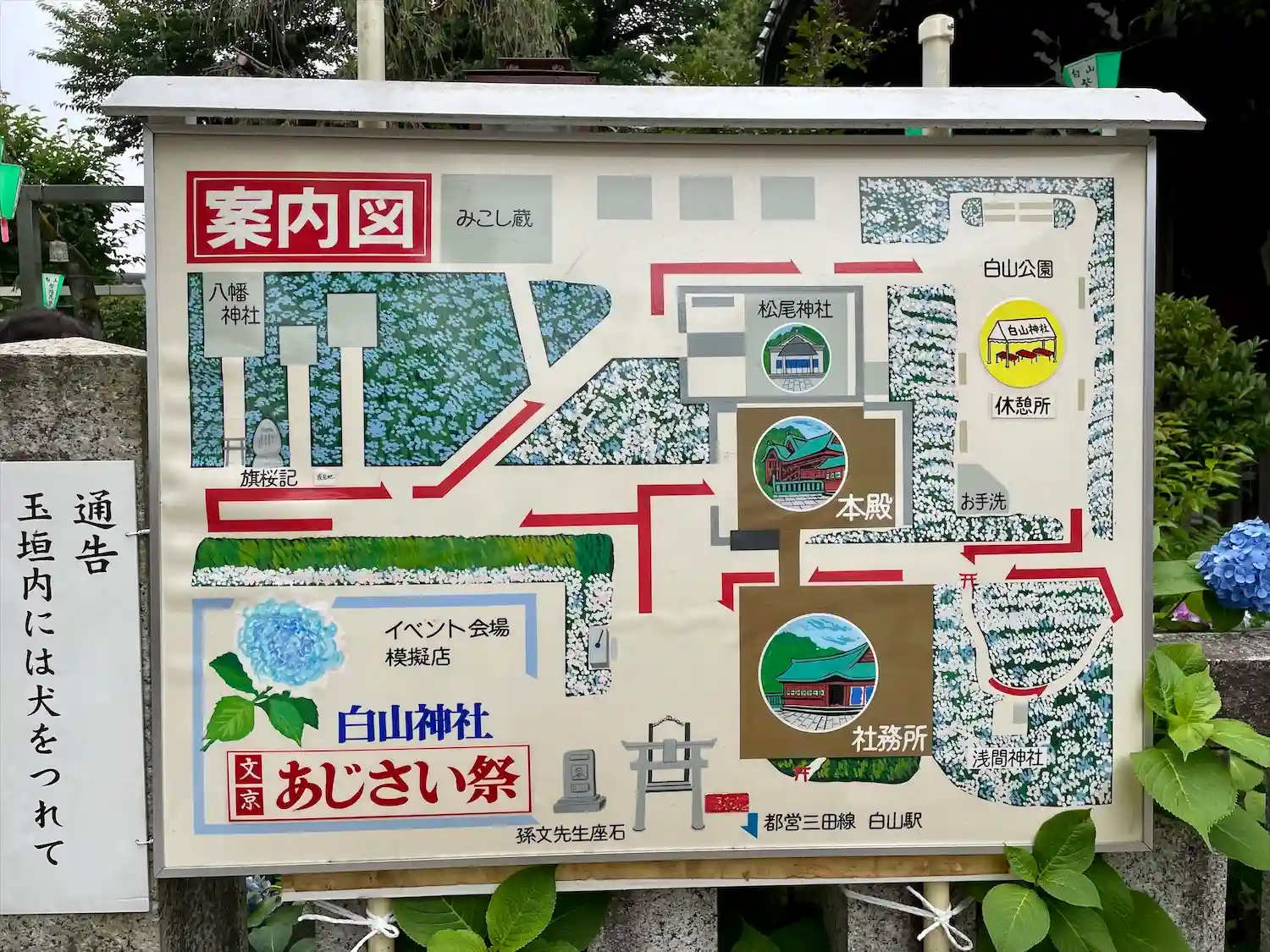 毎年6月の中旬に文京花の五大まつりのひとつ文京あじさいまつりが開催され、境内や隣接する白山公園では、約3,000株の紫陽花を見ることが出来る。まつりの会期中は富士塚が公開され、土日を中心に歯ブラシ供養や縁日など、様々な催しが実施される。