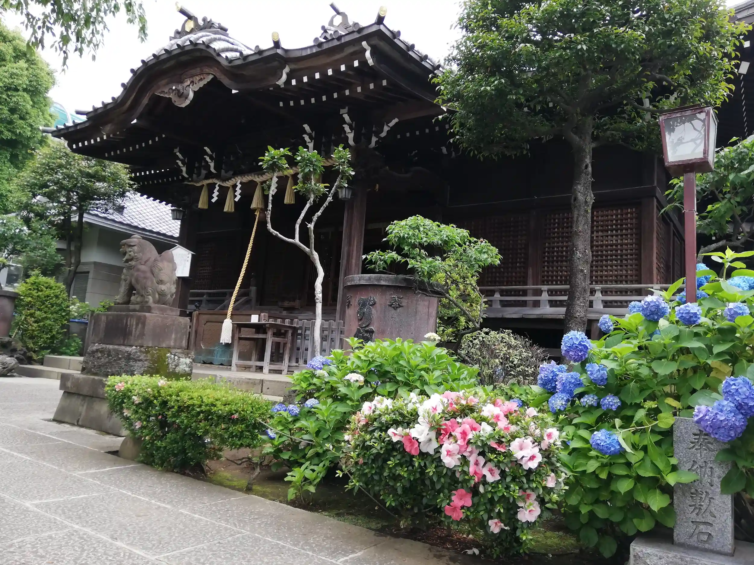 社殿。つつじの赤と紫陽花の青がきれいです