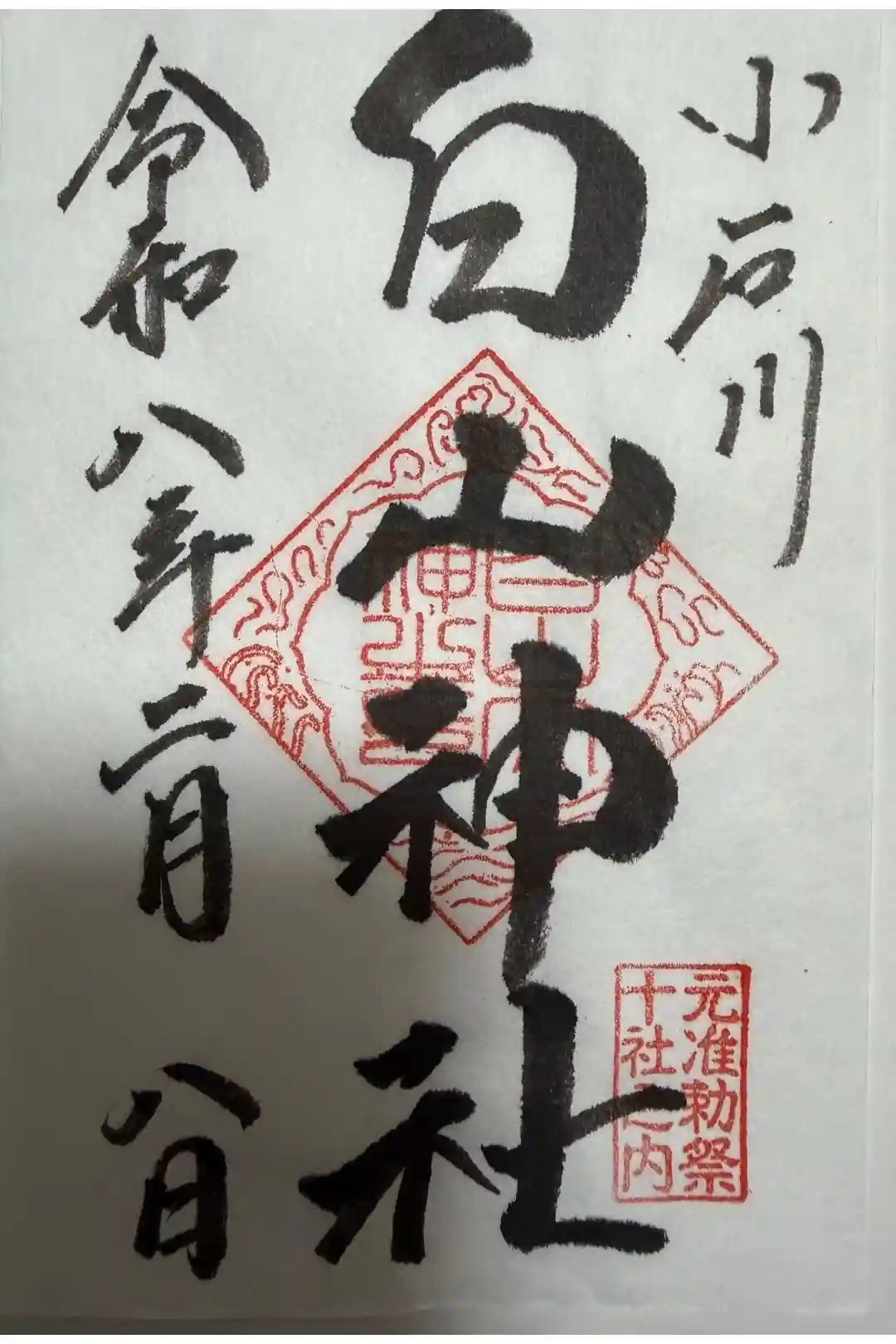 真ん中に神社印が押され、その上から「白山神社」と墨書きされています。