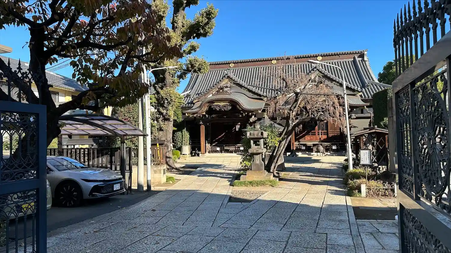 周りの道が歩行者専用のようで、山門に真っ直ぐ続く道から山門をくぐる必要がありますが、境内に駐車出来…