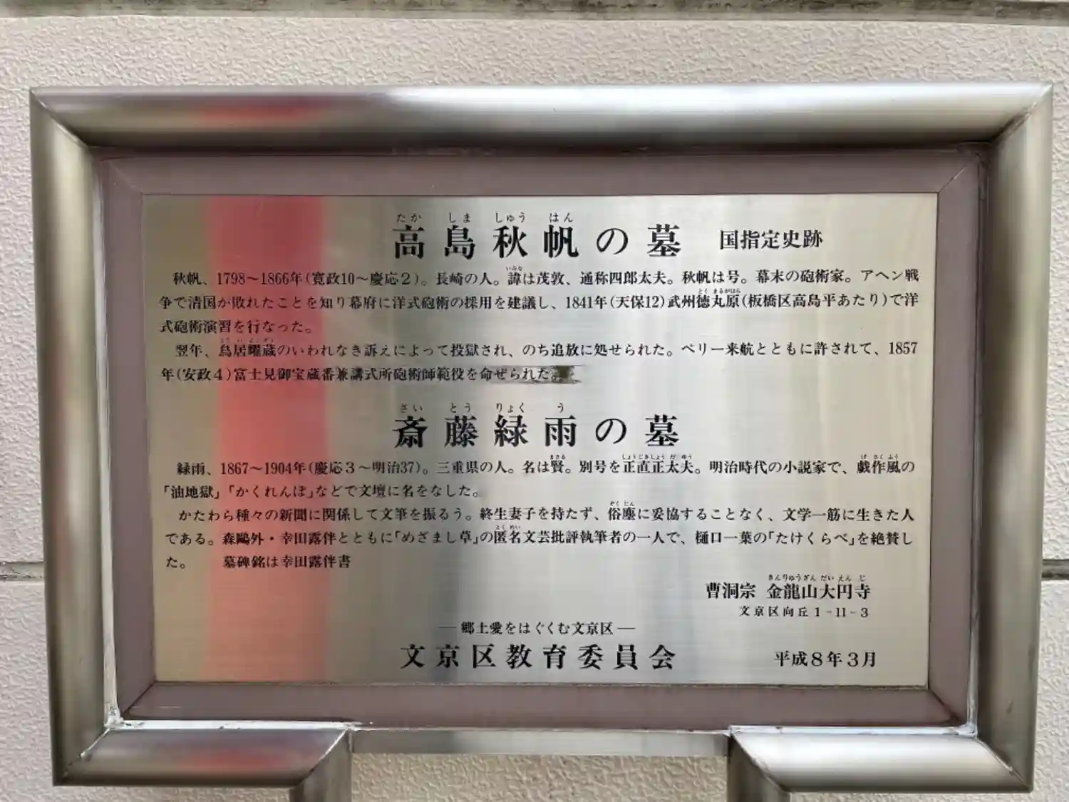 大円寺〜墓所入口、高島秋帆墓の碑