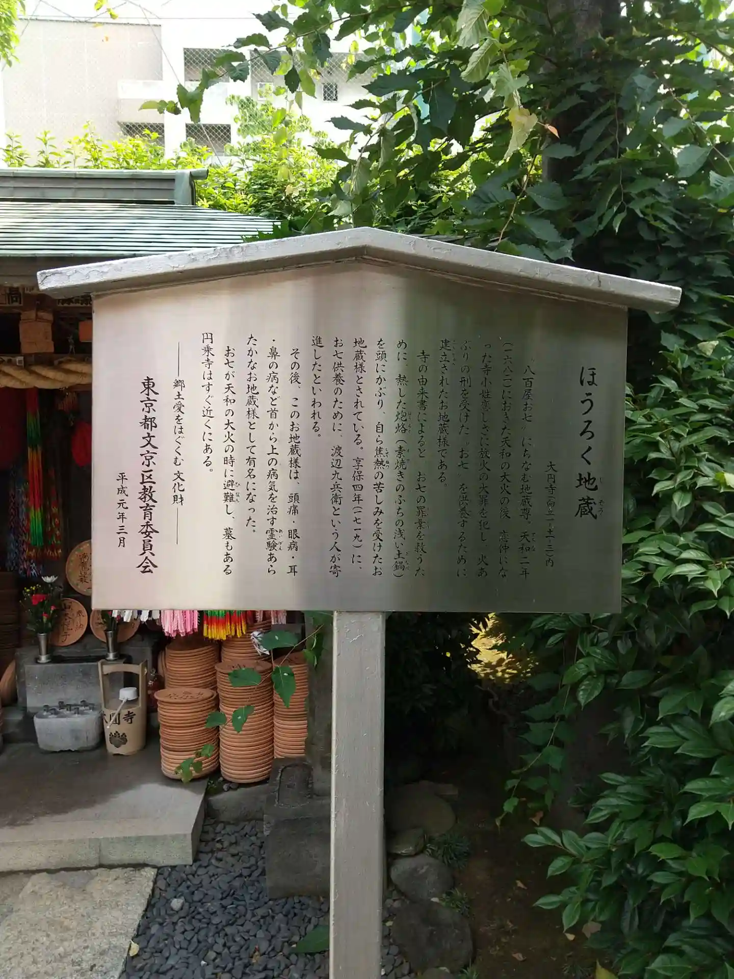 お七の罪業わ救うために、熱した焙烙を頭にかぶり、自ら焦熱の苦しみを受けたお地蔵様とされいる。享保四年(1719)にお七の供養のために、渡辺久兵衛という人が寄進したといわれる