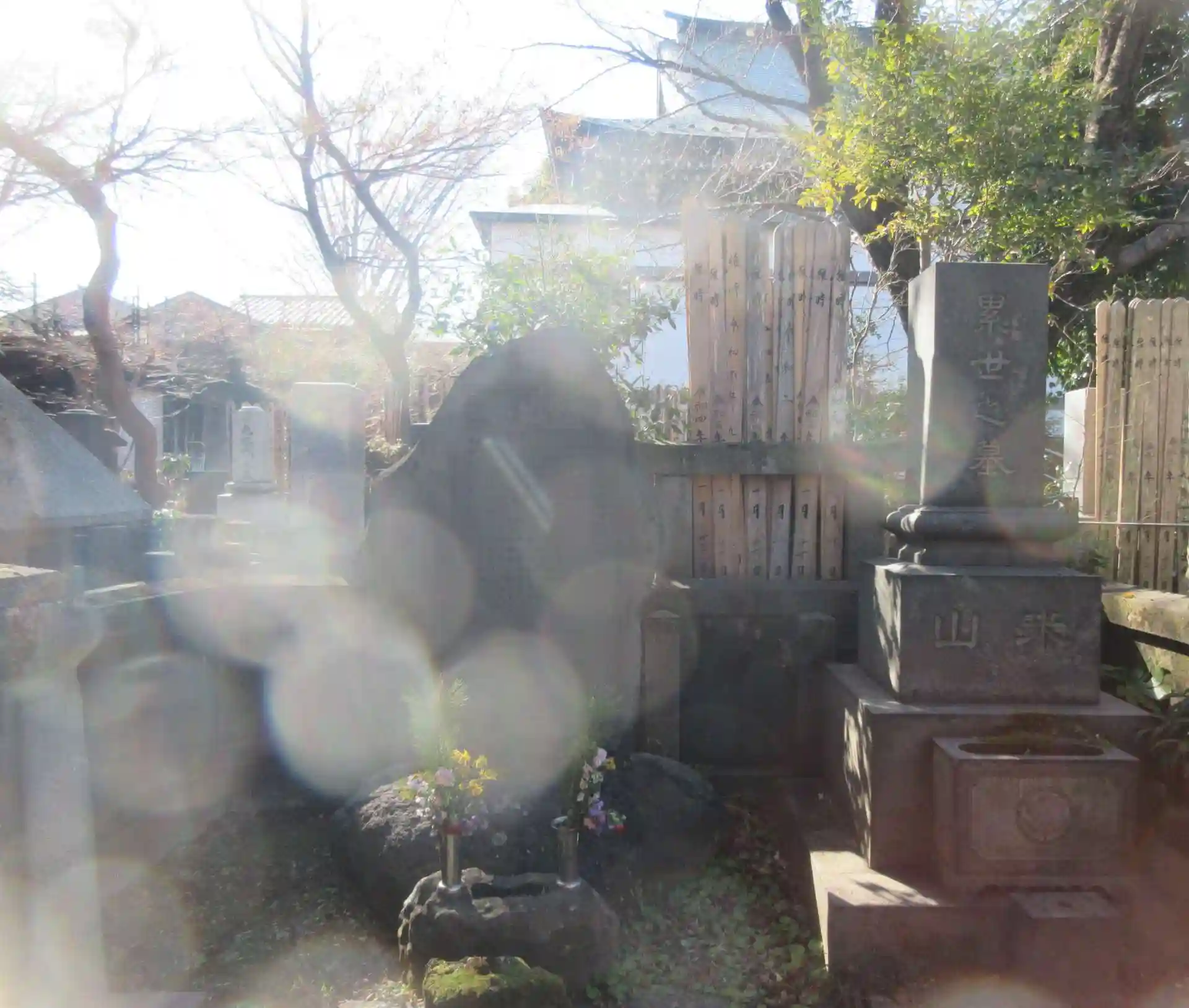 夏目漱石の作品に出て来るお寺ということで、行きたいと熱望していた。だが、そのキヨのお墓がわからない。しかも、臨済宗寺院の寺族からは「檀家さん以外はお断り」「方丈さん(禅宗で住職のこと。他の宗派では言わない)も知らないの?恥ずかしい」という扱いを多く受けており、法事でここにいる一般人に聴いてみようか?などと迷っていた。そこに、たまたま寺の僧侶が通りかかり、勇気を出して声掛け。なんと!!お墓まで案内してくれたのだ。漱石が東大生の頃に下宿していた家で世話をしてくれた方らしい。米山保三郎という漱石の親友の祖母であるとのこと。