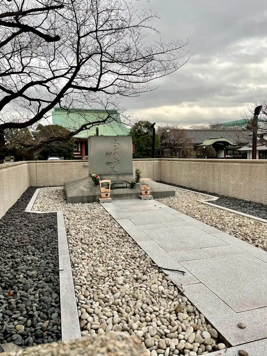 参道左手にある<お七・吉三郎比翼塚>。吉祥寺を舞台とした「八百屋のお七」の悲恋の話の二人を供養する。