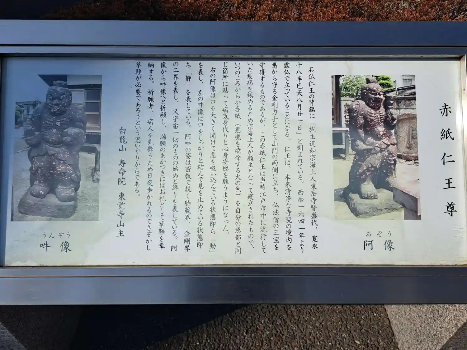 参詣客が赤色の紙を貼るため“赤紙仁王”の名で呼ばれるようになった東覚寺の金剛力士立像は、形像の背面にある銘文から、寛永18年(1641)8月21日、東覚寺住職賢盛の時代に、宗海という僧侶が願望となって選望されたことが分かります。