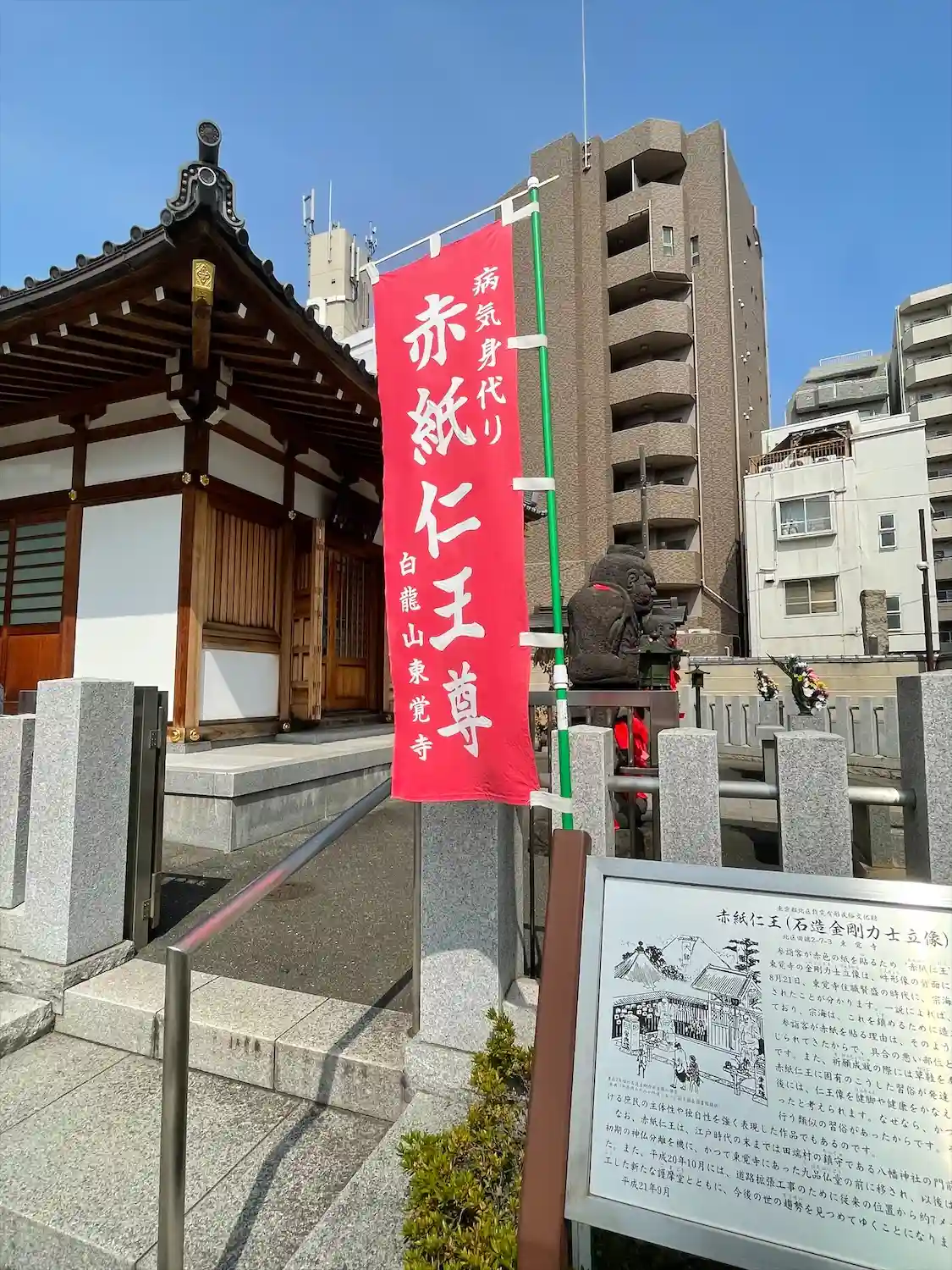 田端駅から徒歩5分ほど。護摩堂の前に一対の仁王像があり、全身に赤い紙が貼られていることから、赤紙仁…