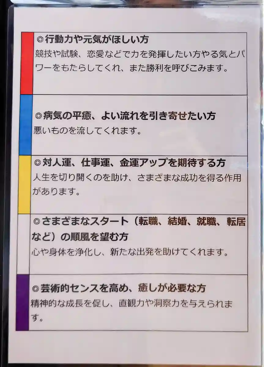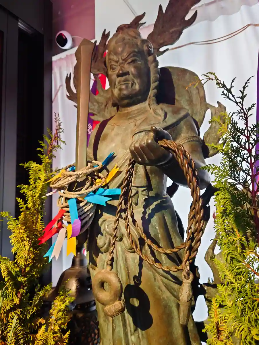 左手の縄にて厄難をつかみ取り、右手にもつ剣にて立ち切ります。滝の浄水が全てを浄化するように、頭や心の中の曇りが浄められるとお参りされています。