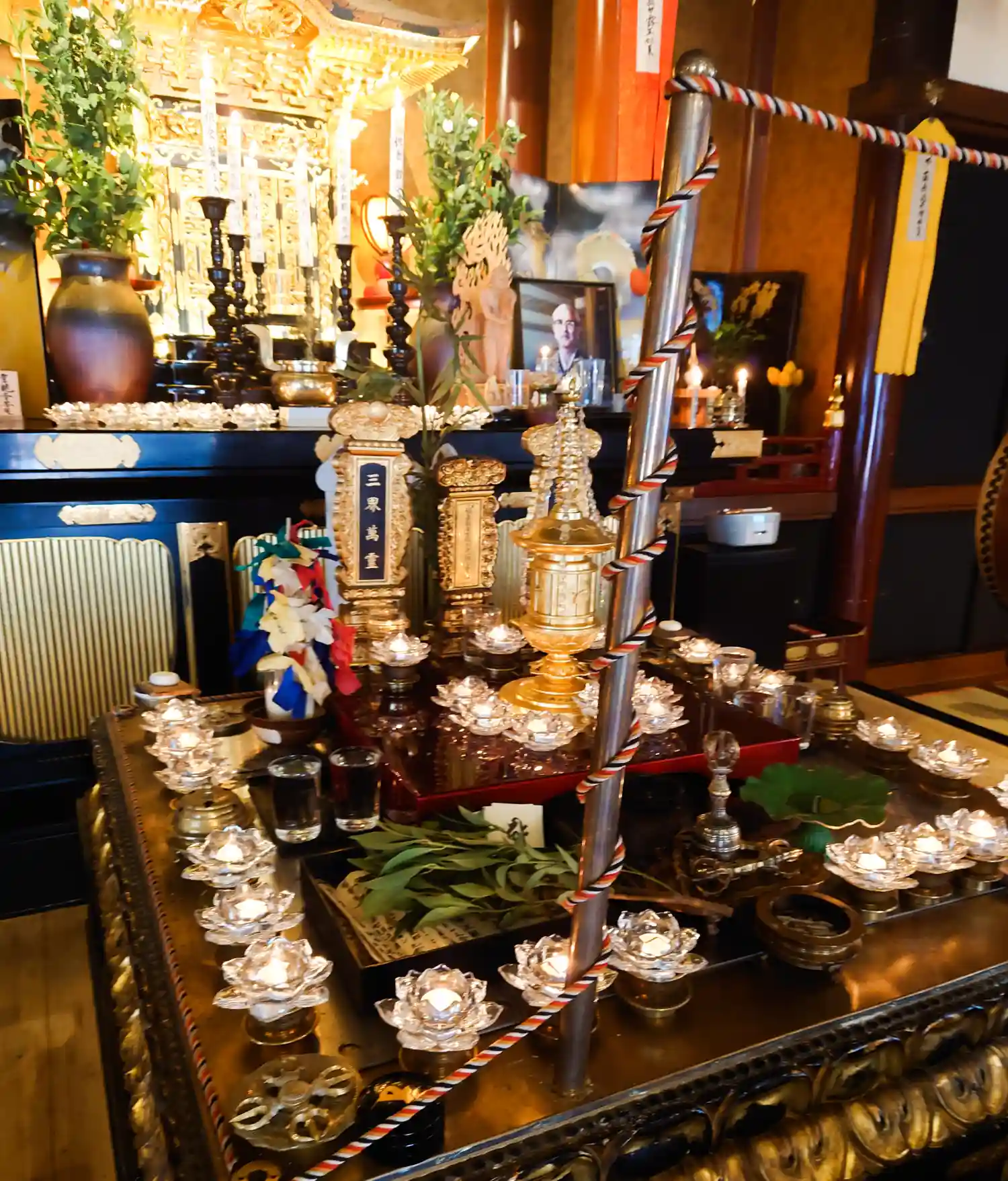 大きな法要の時は、クリスタルの蓮キャンドルに全部火が灯ります。