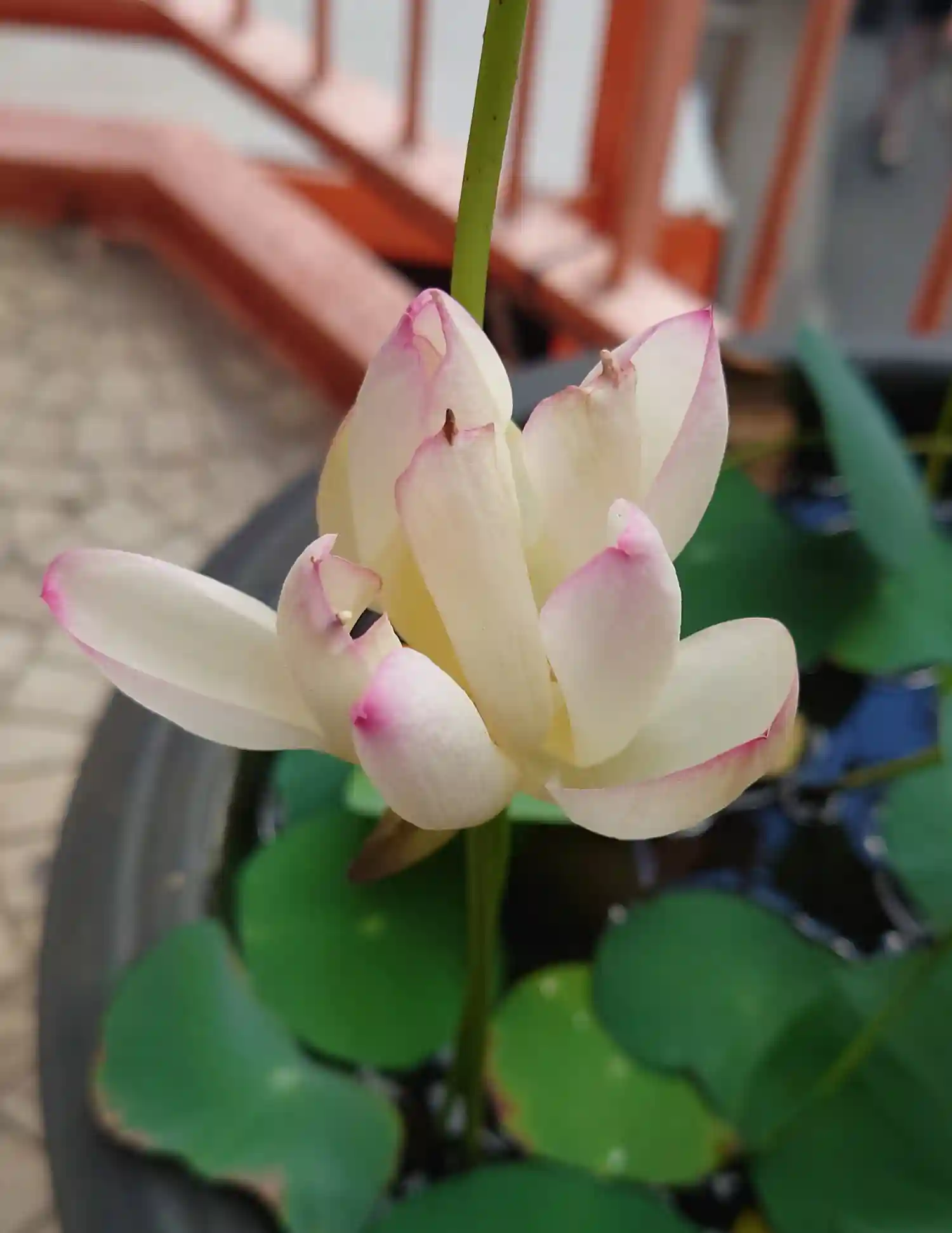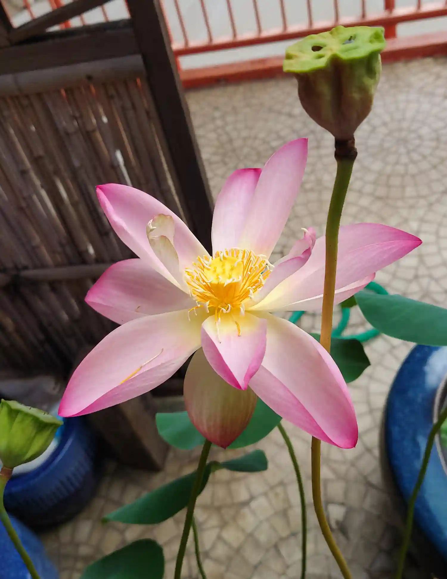 手前にボヤけて写っているのは蓮の蕾です。一個既に咲き終えていて、大きな蕾があるけど次の参拝時には散ってそう⤵️