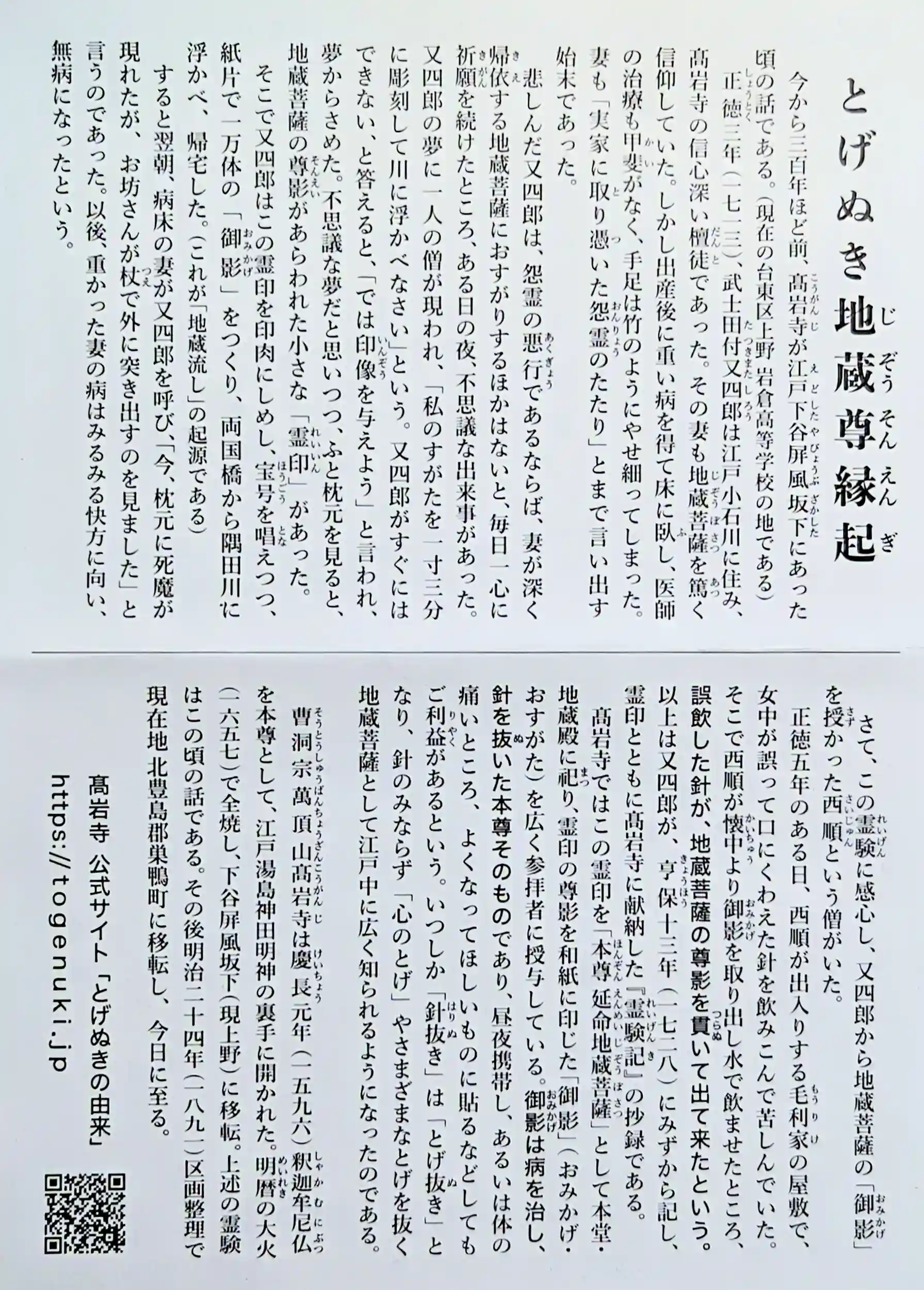 2年後の正徳5年のこと、毛利家の大名屋敷で針を誤飲した女性に、この地蔵尊像を写し取った紙札を飲ませたところ、 針が紙札の地蔵尊を貫いて出てきたのが「とげぬき」のはじまりです。