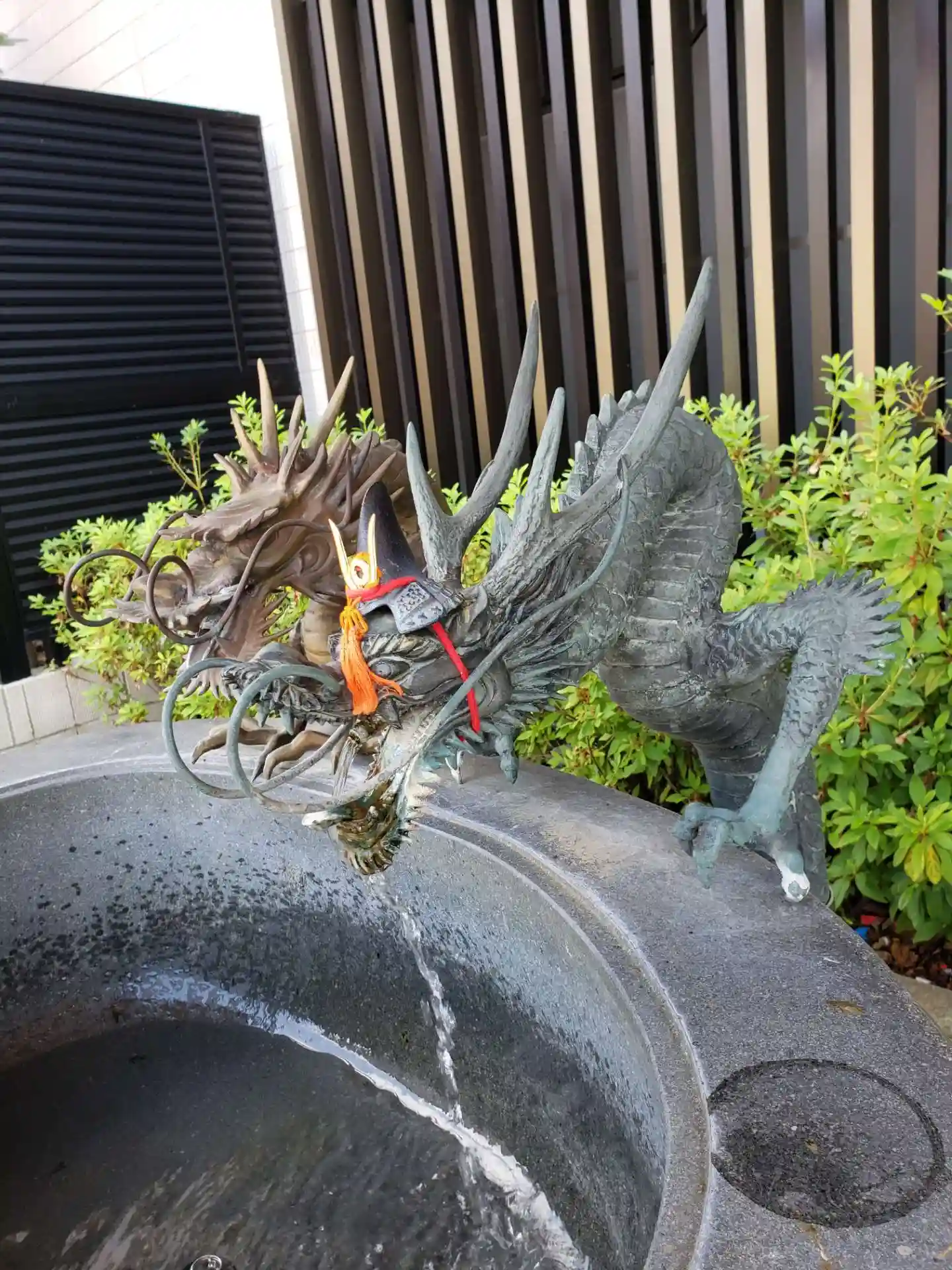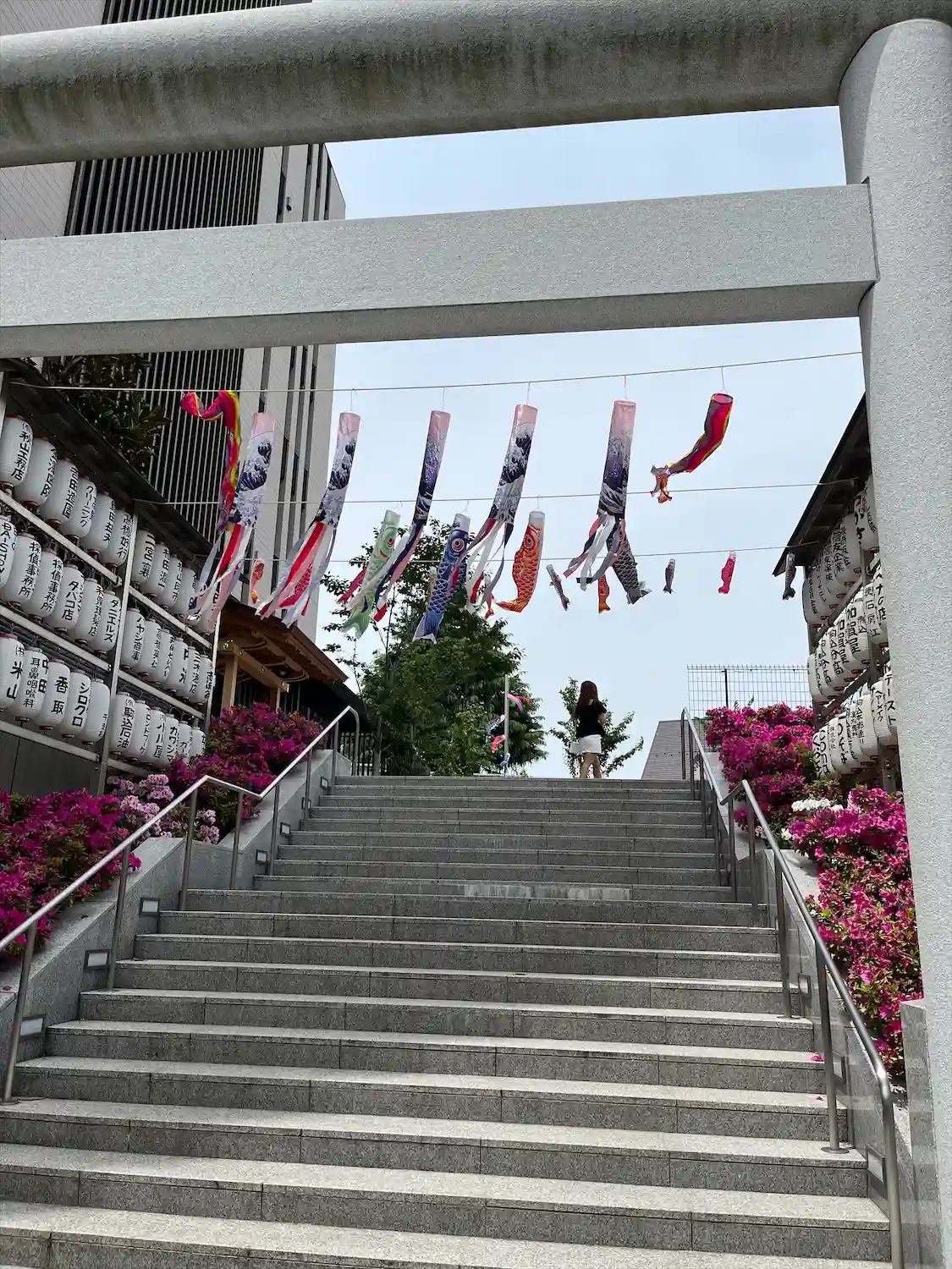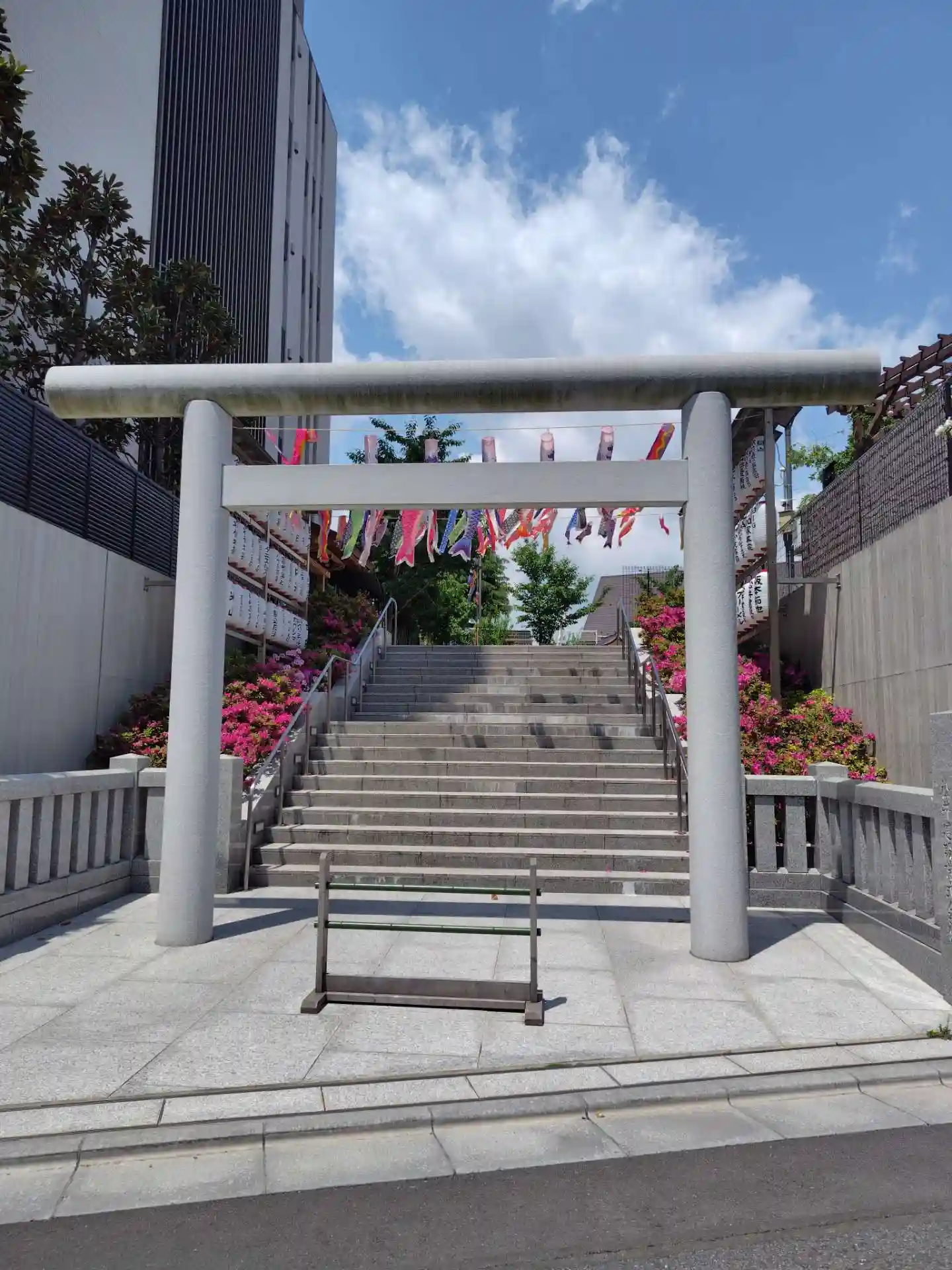 鳥居をくぐると、鯉のぼりがたくさん泳いでいました。手水には龍の頭に兜が乗って…