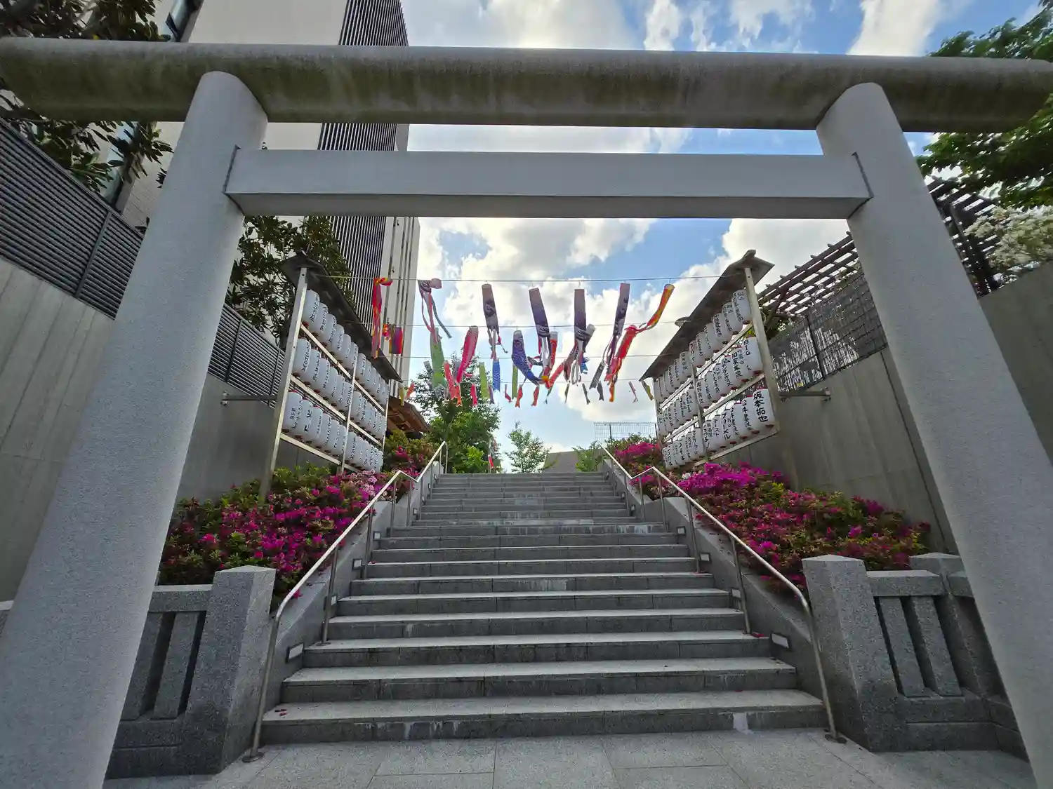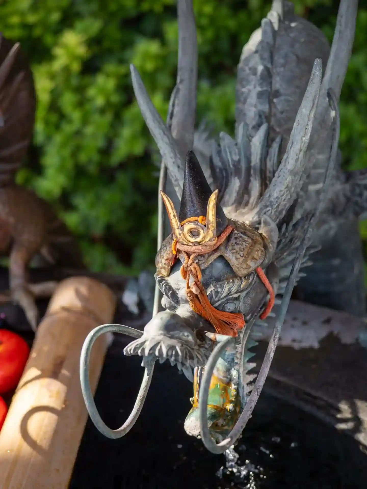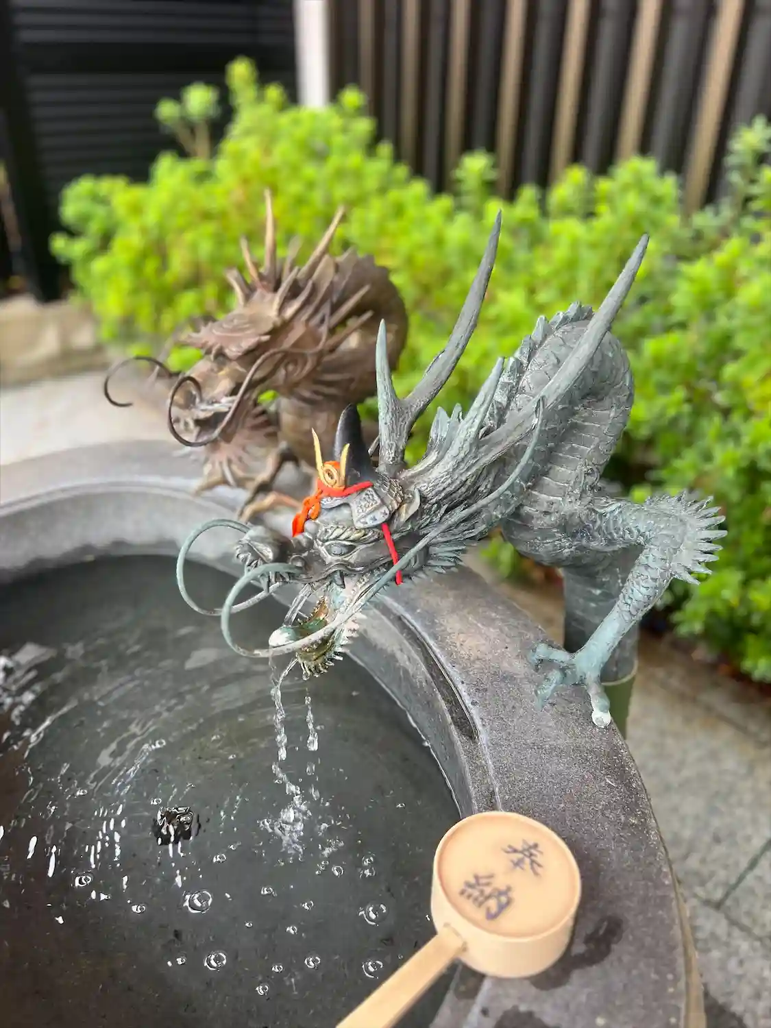 鳥居をくぐると、鯉のぼりがたくさん泳いでいました。手水には龍の頭に兜が乗って…