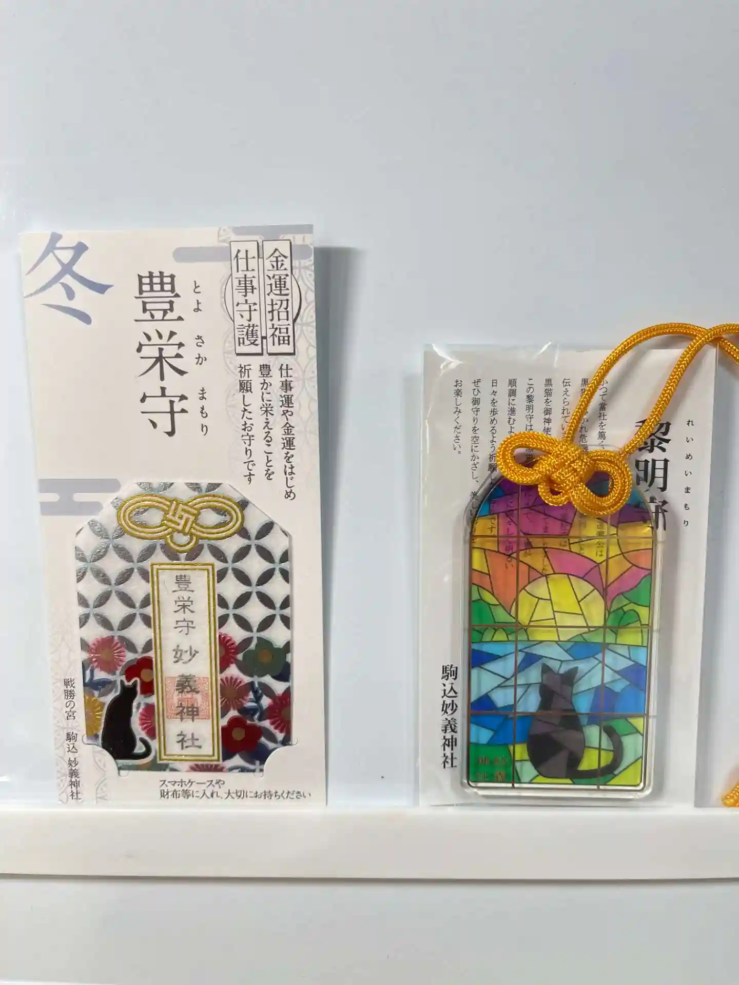 右側 『黎明守』黒猫の導きによって昇る朝日のように力強く、人生に光が差し、迷い戸惑うことのないよう御祈念した御守り。