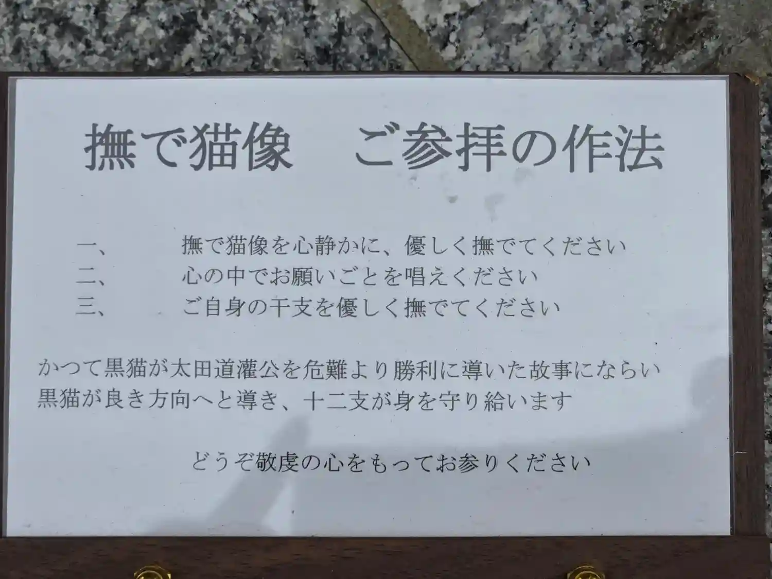 撫で猫像を撫でながら願いを伝えます。
