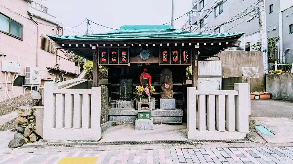 また、地蔵堂内にはおかっぱ頭のセーラー服姿の童女が片手に宝珠を持ち、もう一人は錫杖を持って手をつないでいる供養碑があります。昭和8年にこの近くで交通事故で亡くなった11歳の仲良しの少女を供養するために建てられたもので、以後子育地蔵尊とともに地域の安全を見守り続けています。(新編武蔵風土記稿では「東福寺」項に記載の地蔵堂とあり、享保12年(1727年)に入仏供養が行われたとしています)
