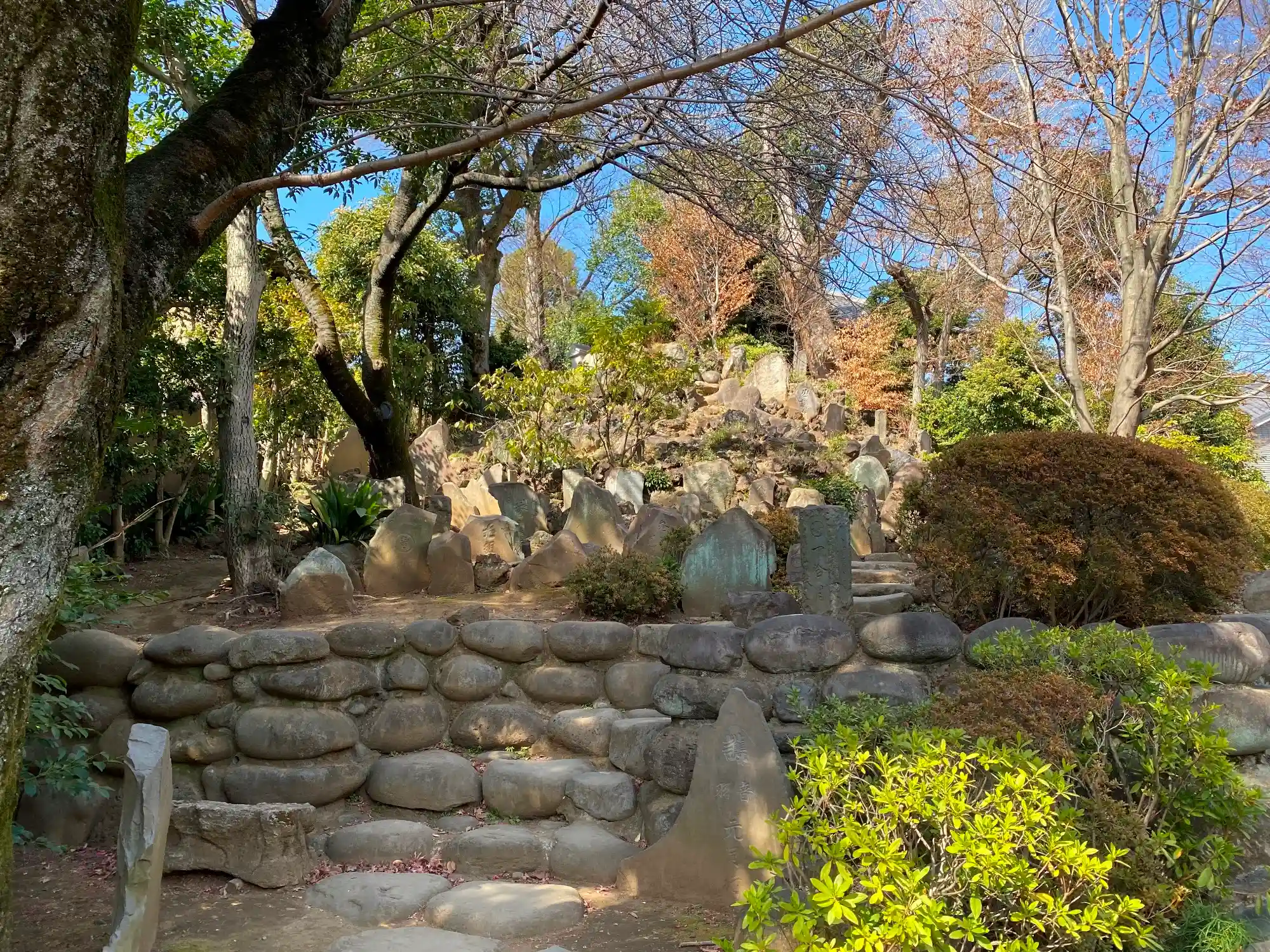 境内の右奥に<大隈重信の墓>。神格化され手前に鳥居と燈籠が。