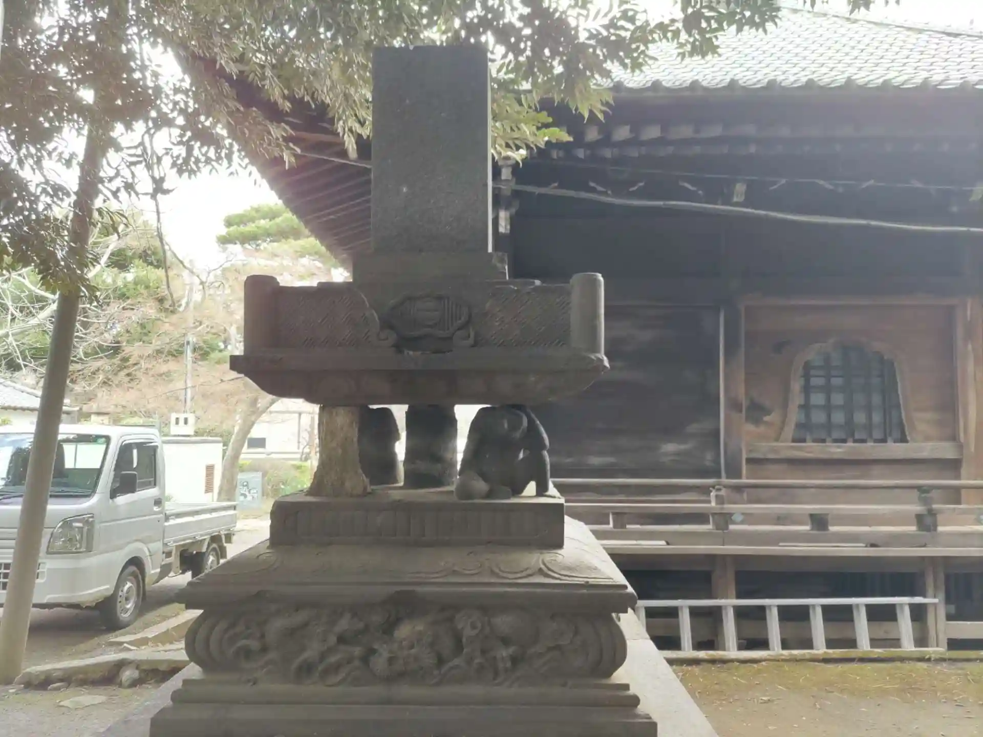 薬師堂裏手の庚申塔。三猿が支える珍しい形