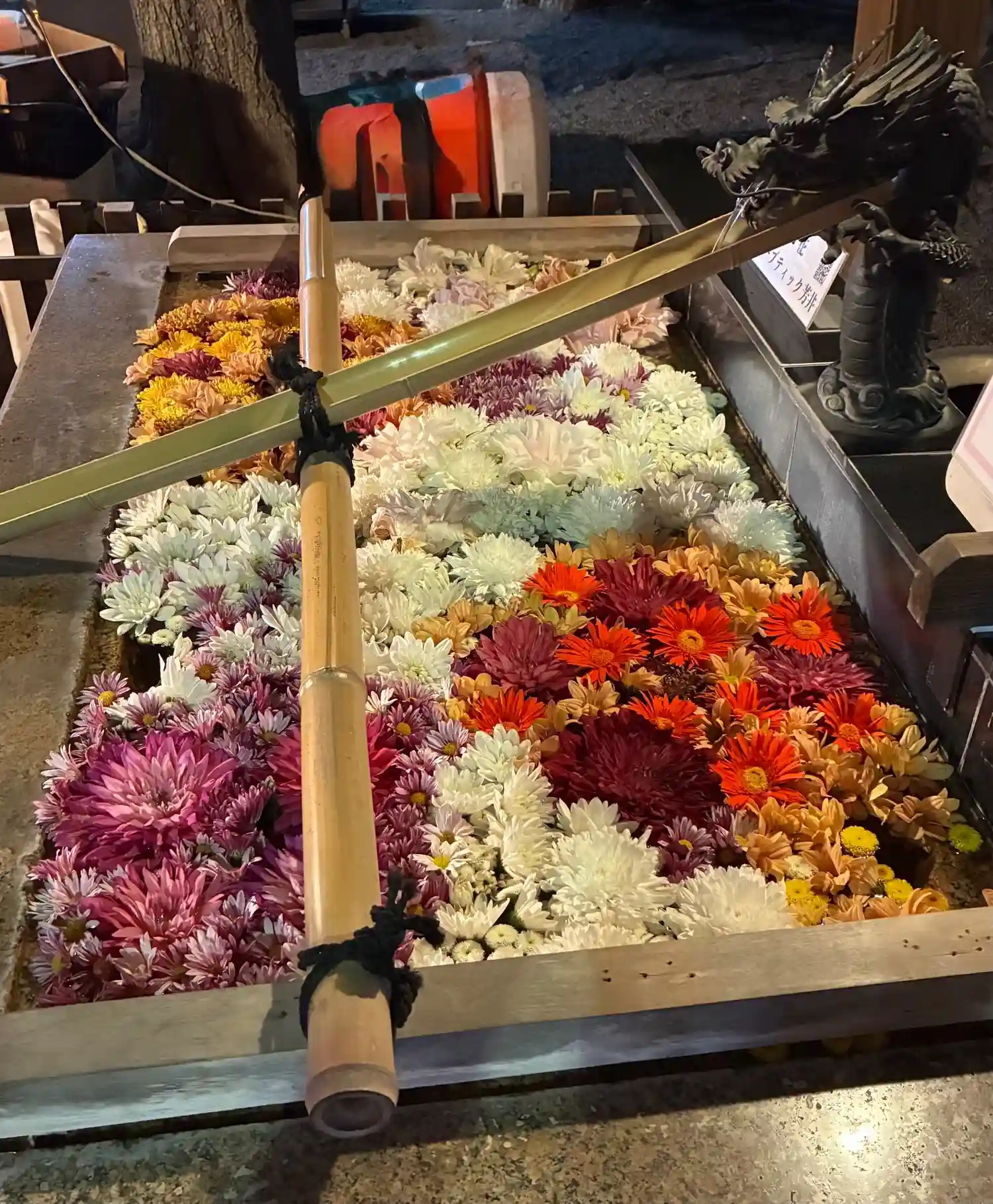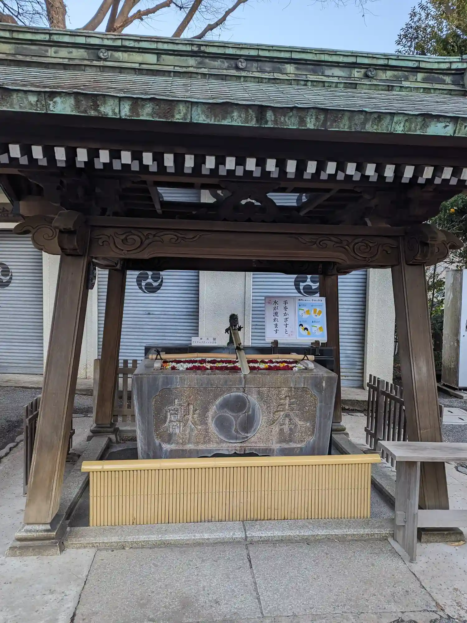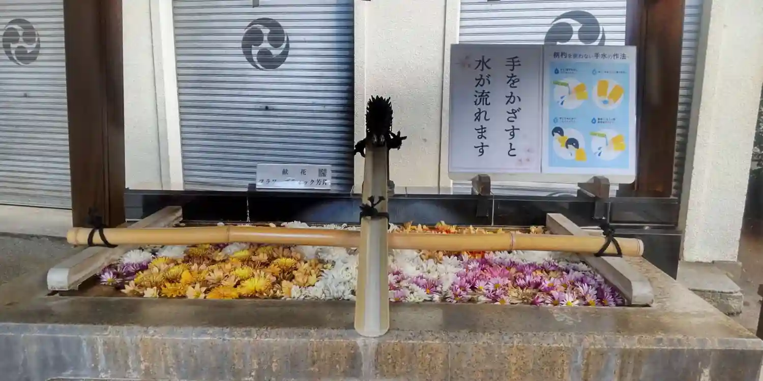 神楽殿では、正月飾りとして、生花が生けられていました。