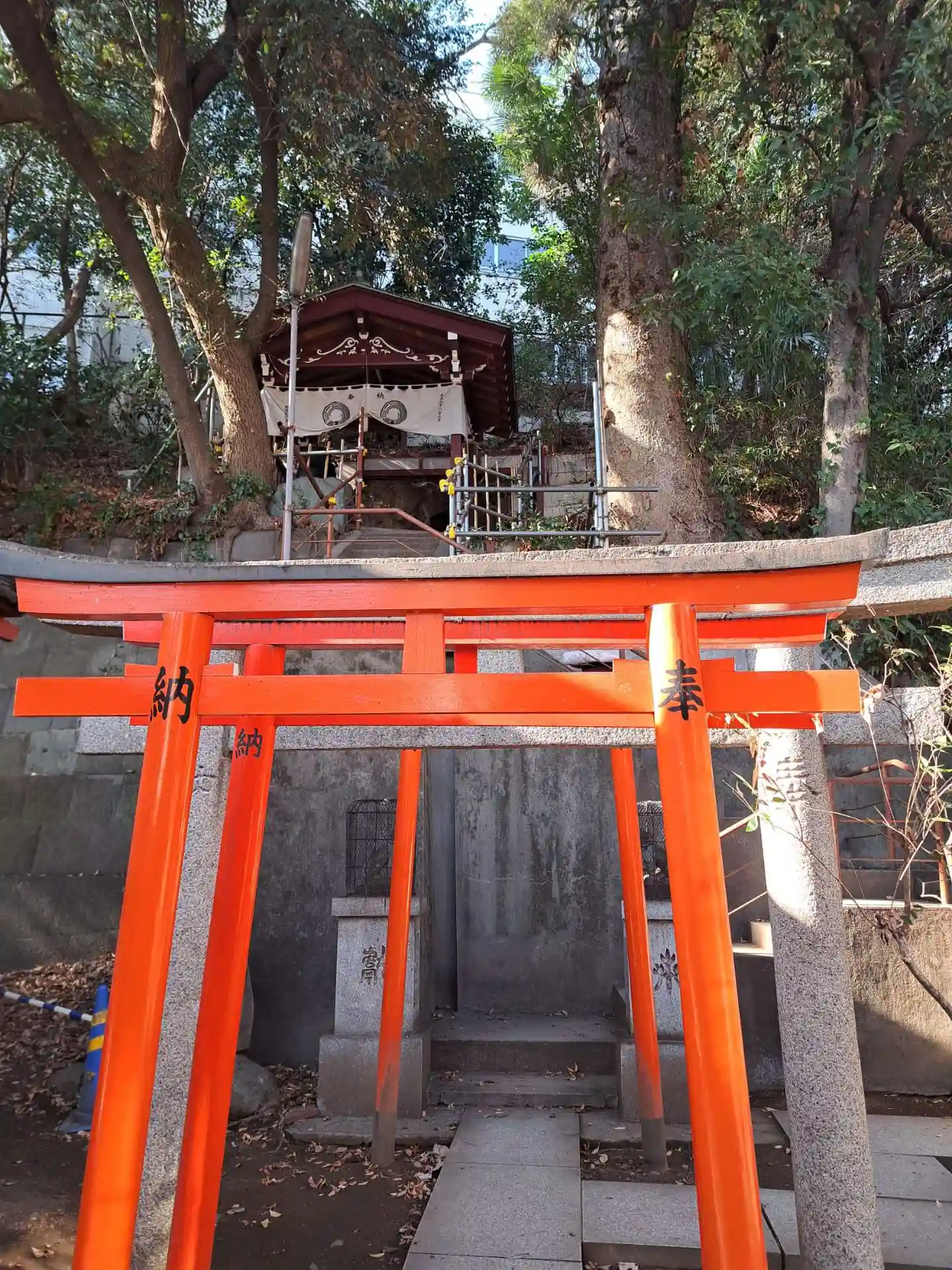 左横の坂道の途中の鳥居から、平日は入ります。