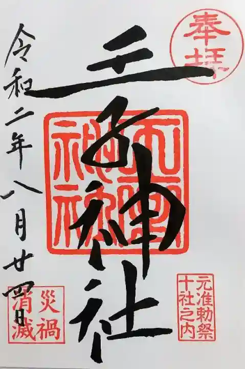 右上に「奉拝」の印、右下に「元准勅祭 十社之内」印、真ん中に神社印、左下に「災禍消滅」印が押されています。