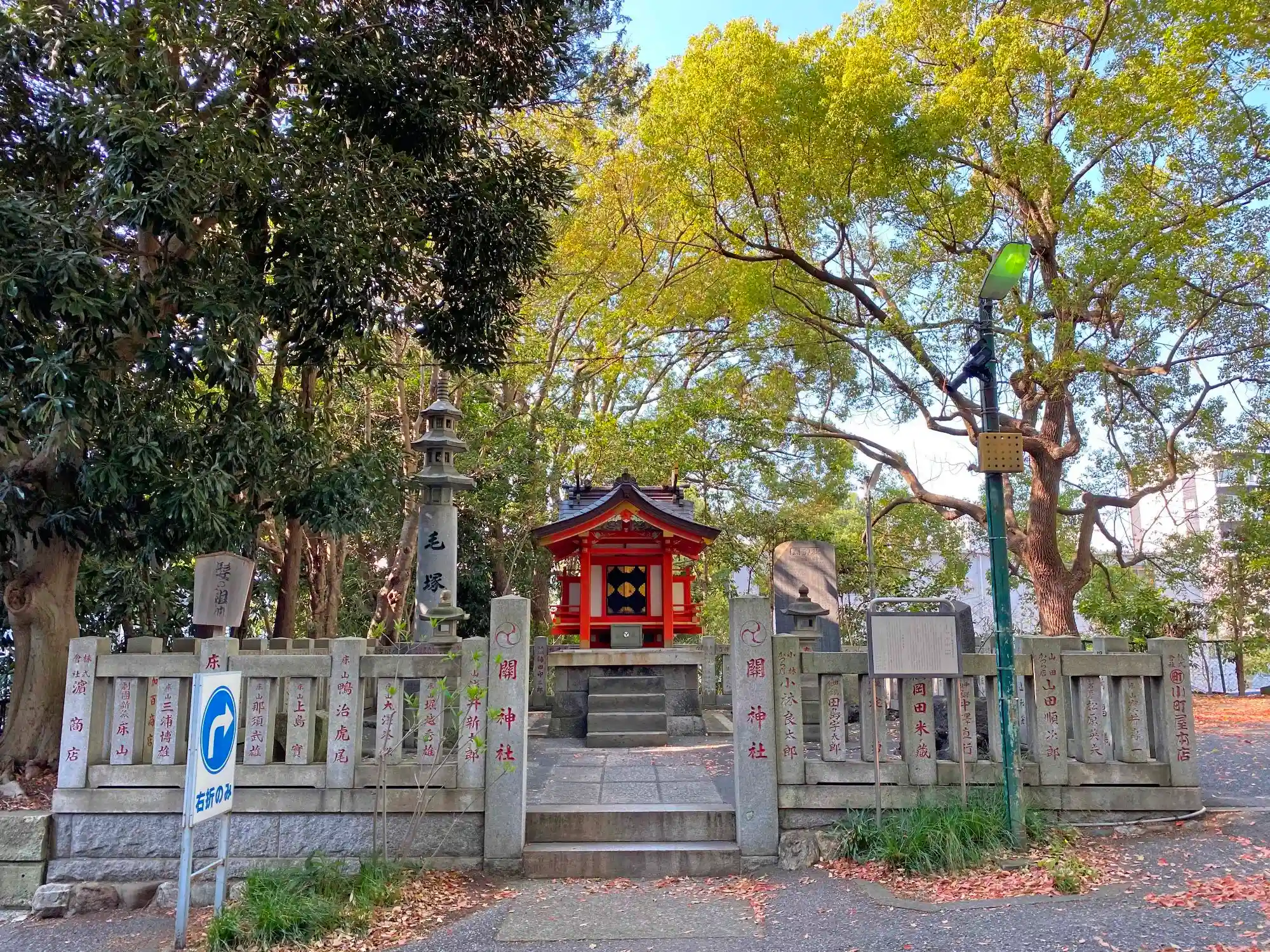大通りから見た<鳥居>と<社号標>。燈籠と社号標が境内から離れているのが変わっている。