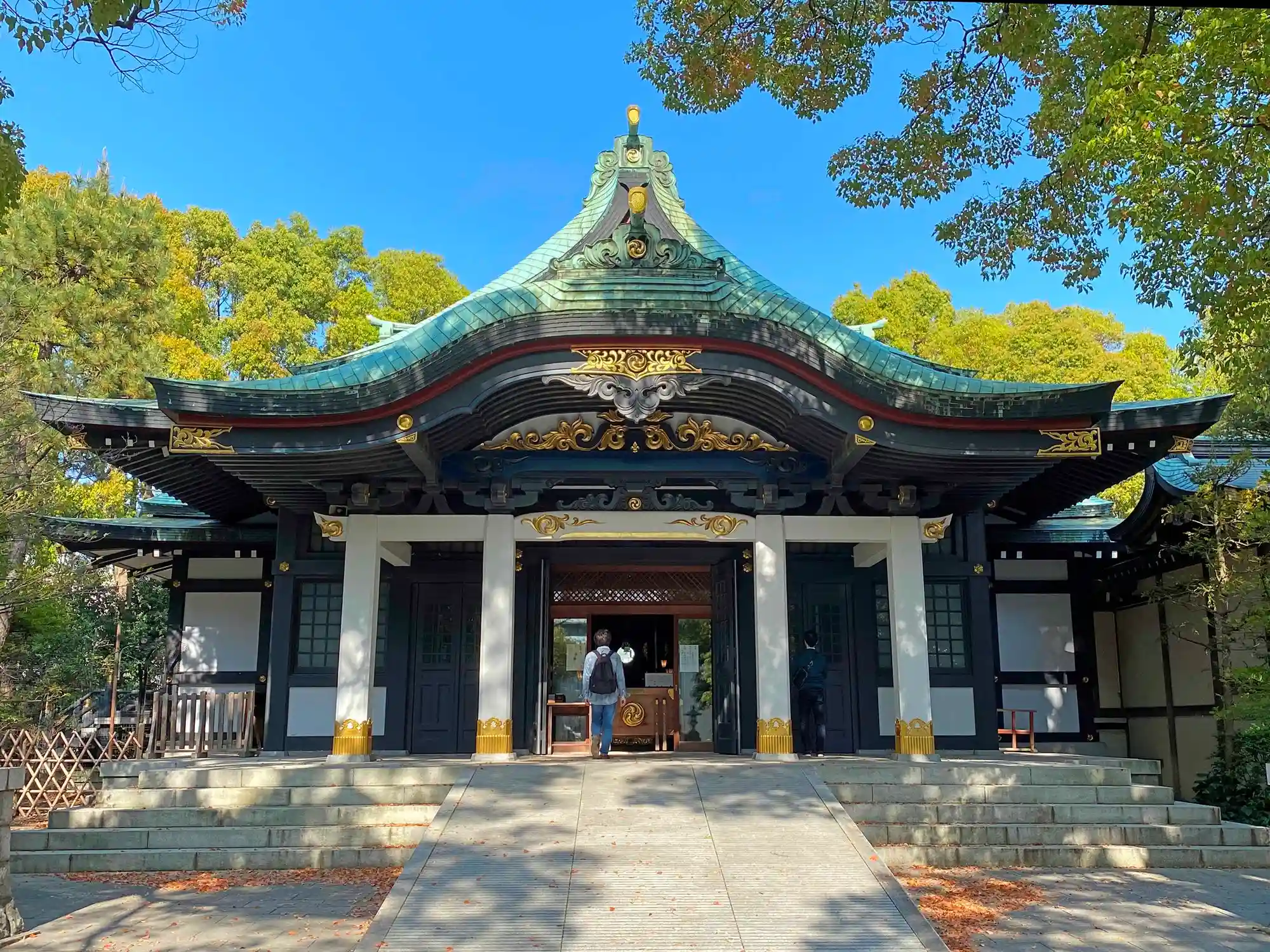 社殿全景。緑の杜に、銅板葺の緑の屋根がマッチしている。