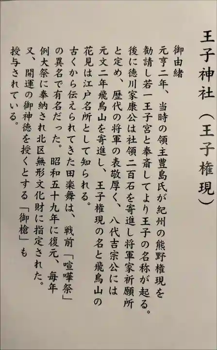 創建: 王子神社の創建は元亨年間(1321-1324年)とされ、当時の領主である豊島氏が紀州熊野三社の神を勧請し、「若一王子宮」として奉斎しました。このことが「王子」という地名の由来となっています。