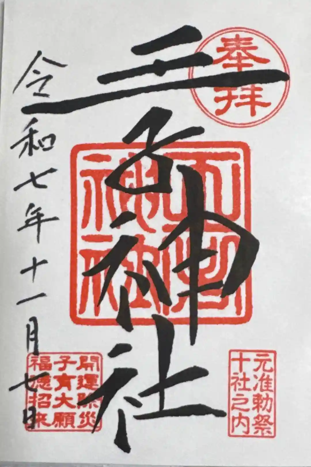 右上に「奉拝」の印、右下に「元准勅祭 十社之内」印、真ん中に神社印、左下に「災禍消滅」印が押されています。