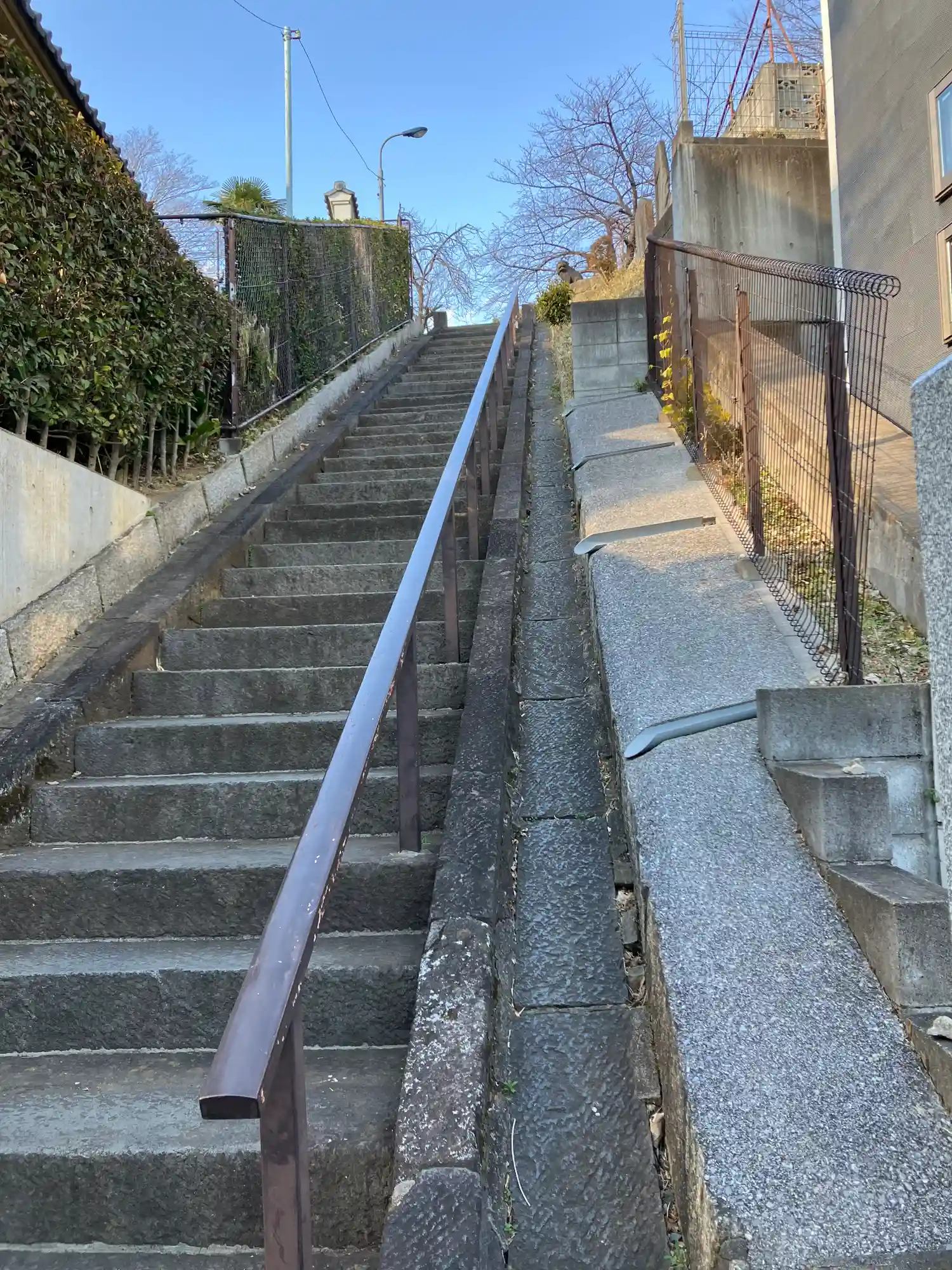 ゆるい坂を歩くと階段が見えます。