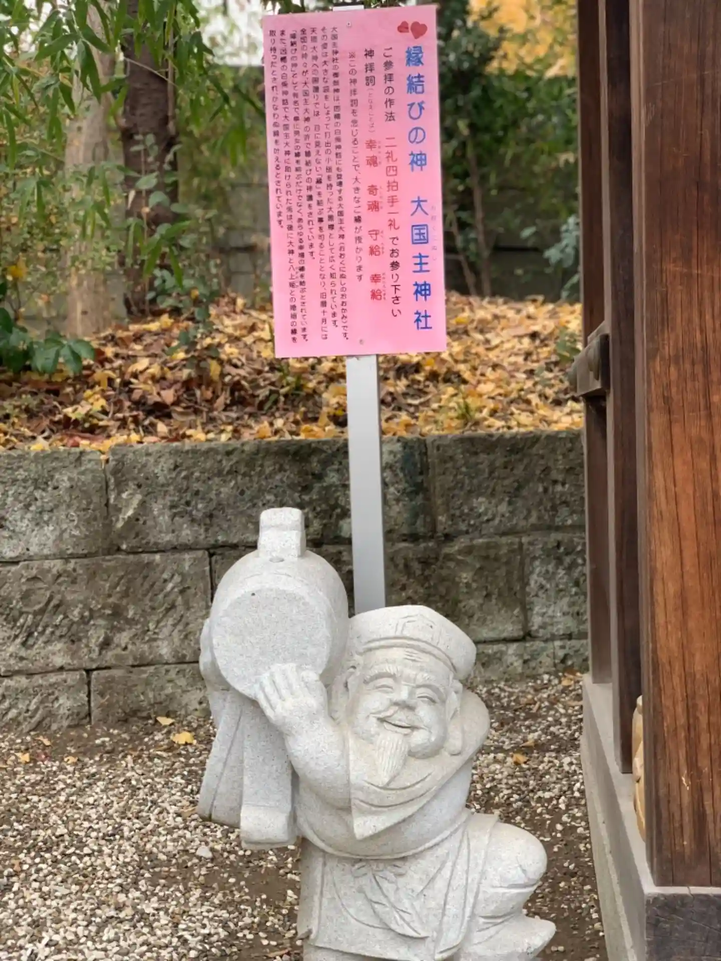 境内に立つ三の鳥居の奥に9社の末社があるが、このうちの1社が縁結びの神様として知られる大国主(おおくにぬし)神社。末社前には大黒様と因幡の白兎(いなばのしろうさぎ)の石像が立ち、神話の世界に導いてくれる。