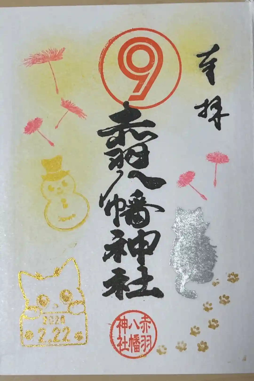 花のイラストと人形代がデザインされた御朱印で、真ん中に赤羽八幡神社と書かれ、上部に無限大マーク、左上に「年越しの大祓い」の印、真ん中に八幡神社の印が押されています。