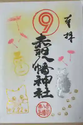 カラフルな紫陽花と鳥がデザインされた御朱印で、真ん中に赤羽八幡神社と書かれ、上部に無限大マーク、真ん中に八幡神社の印が押されています。