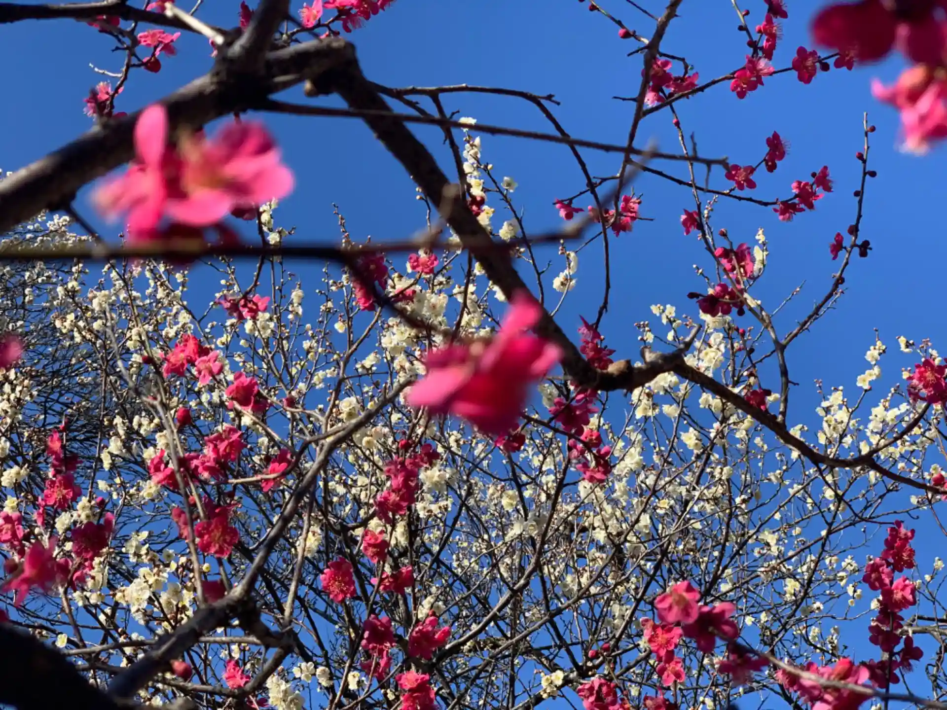 赤と白とピンクの梅の花が良いコントラストで素敵です。😄