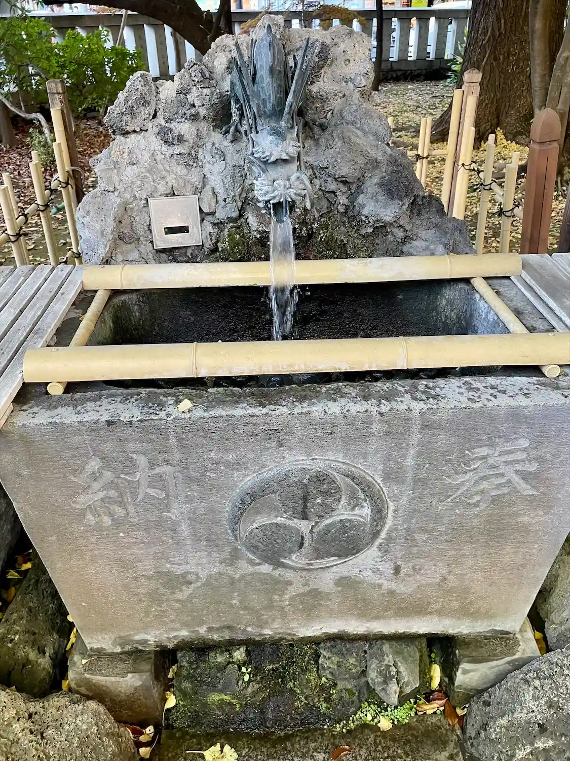 境内は約1300坪の広さで、ケヤキやクスノキなどの大木が繁華街とは思えない静かで荘厳な佇まいを見せる。