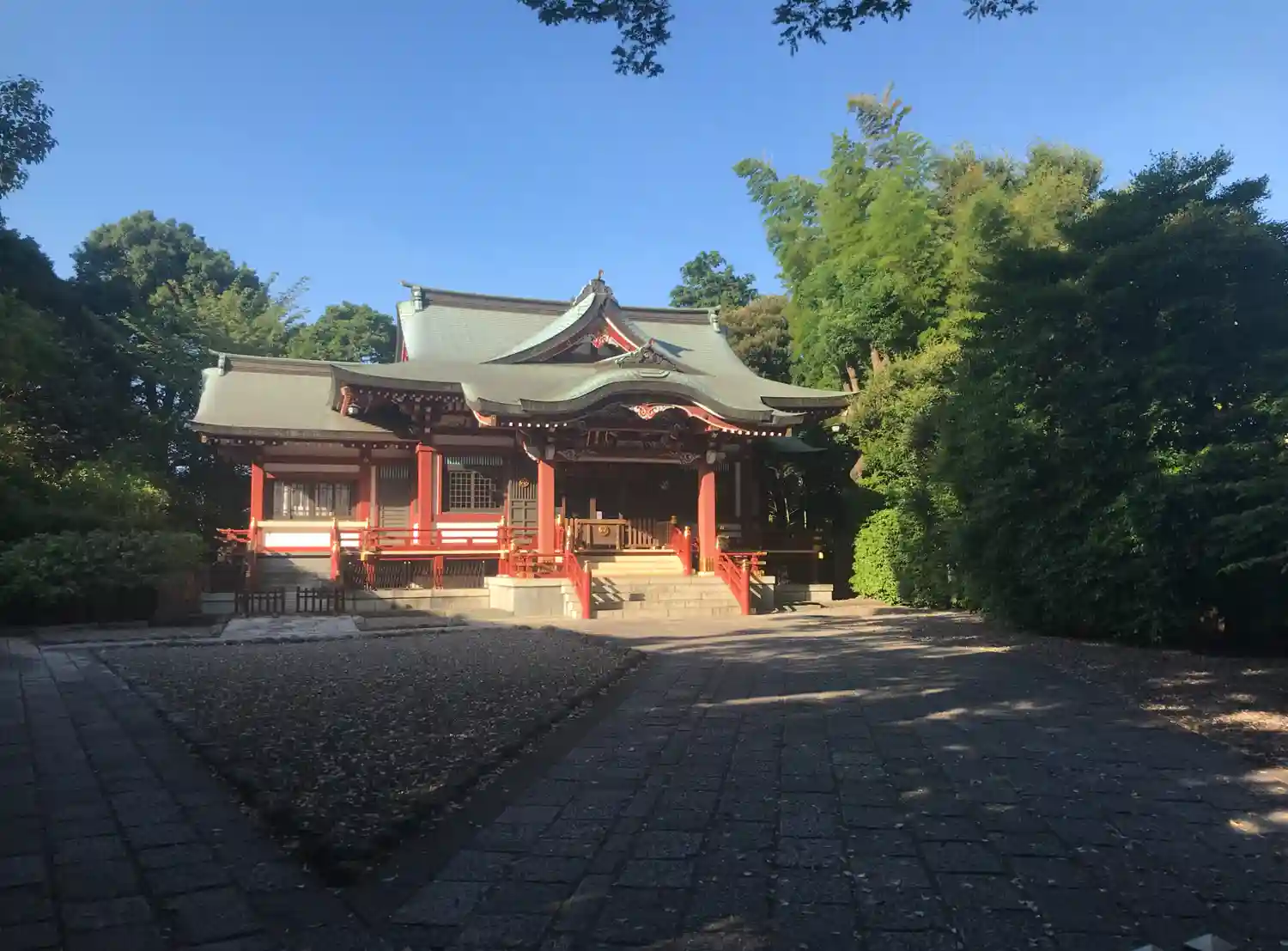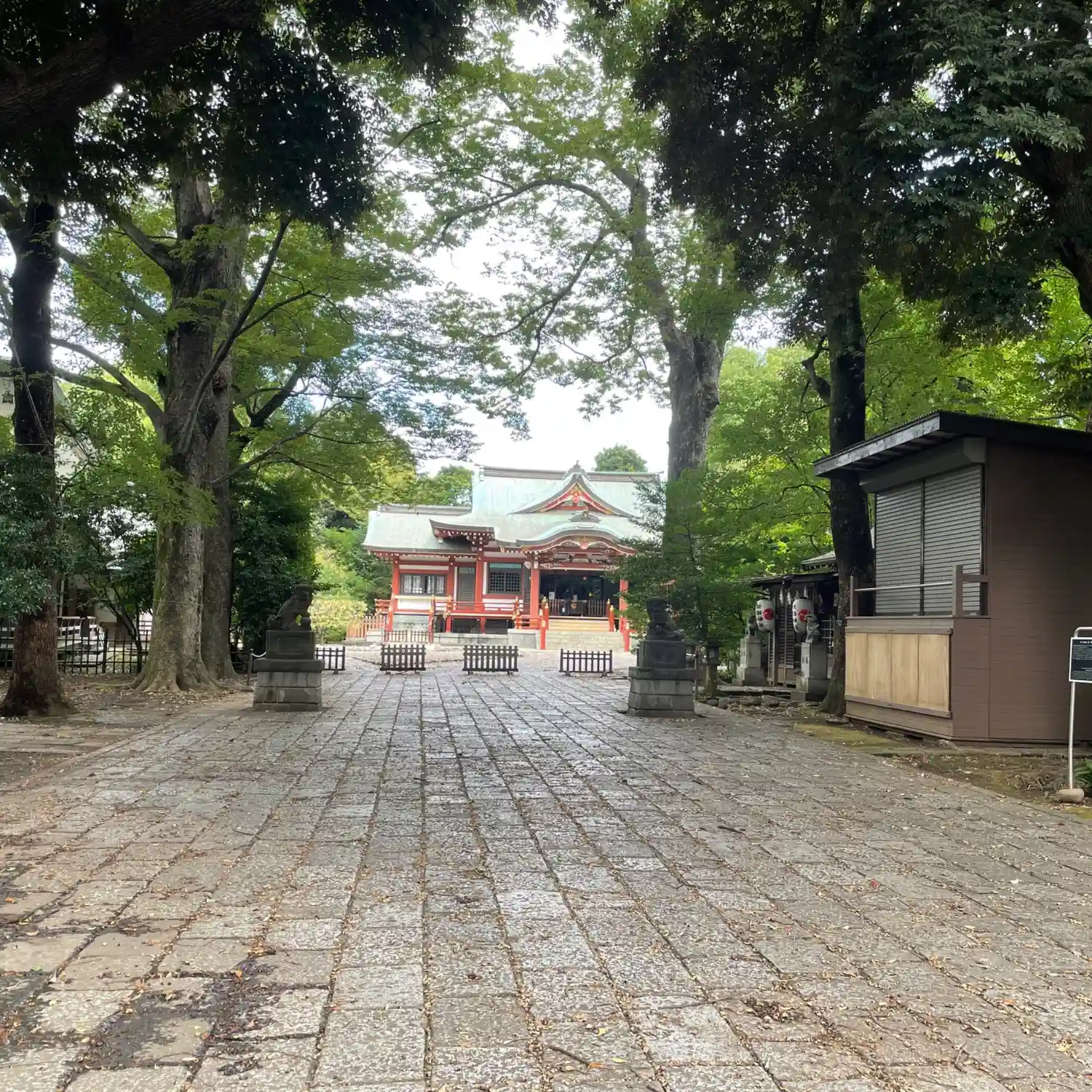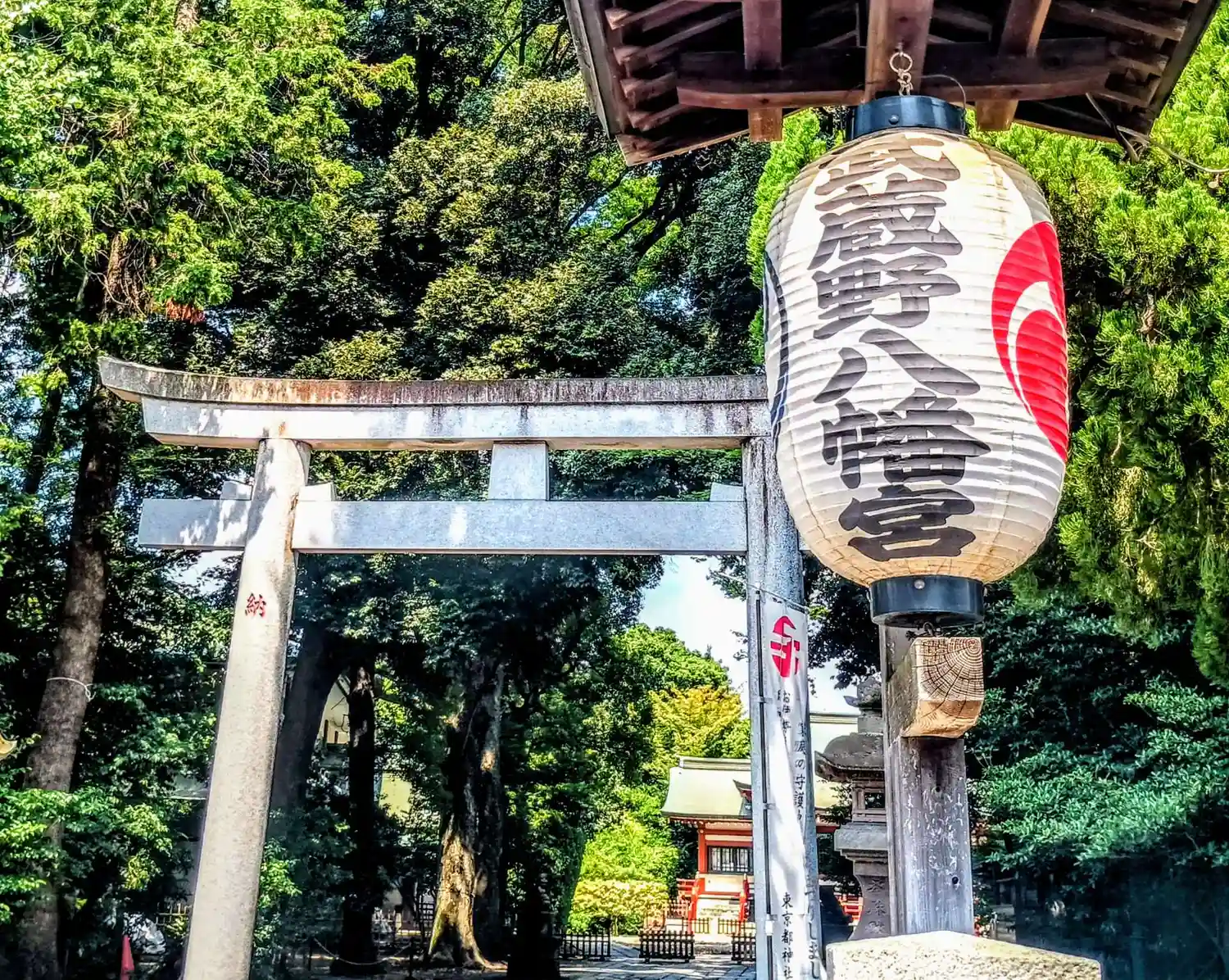 武蔵野八幡宮を訪れ参拝を終えた。境内は緑豊かな大木に囲まれ、木漏れ日が石畳を優しく照らす。赤い鳥居…