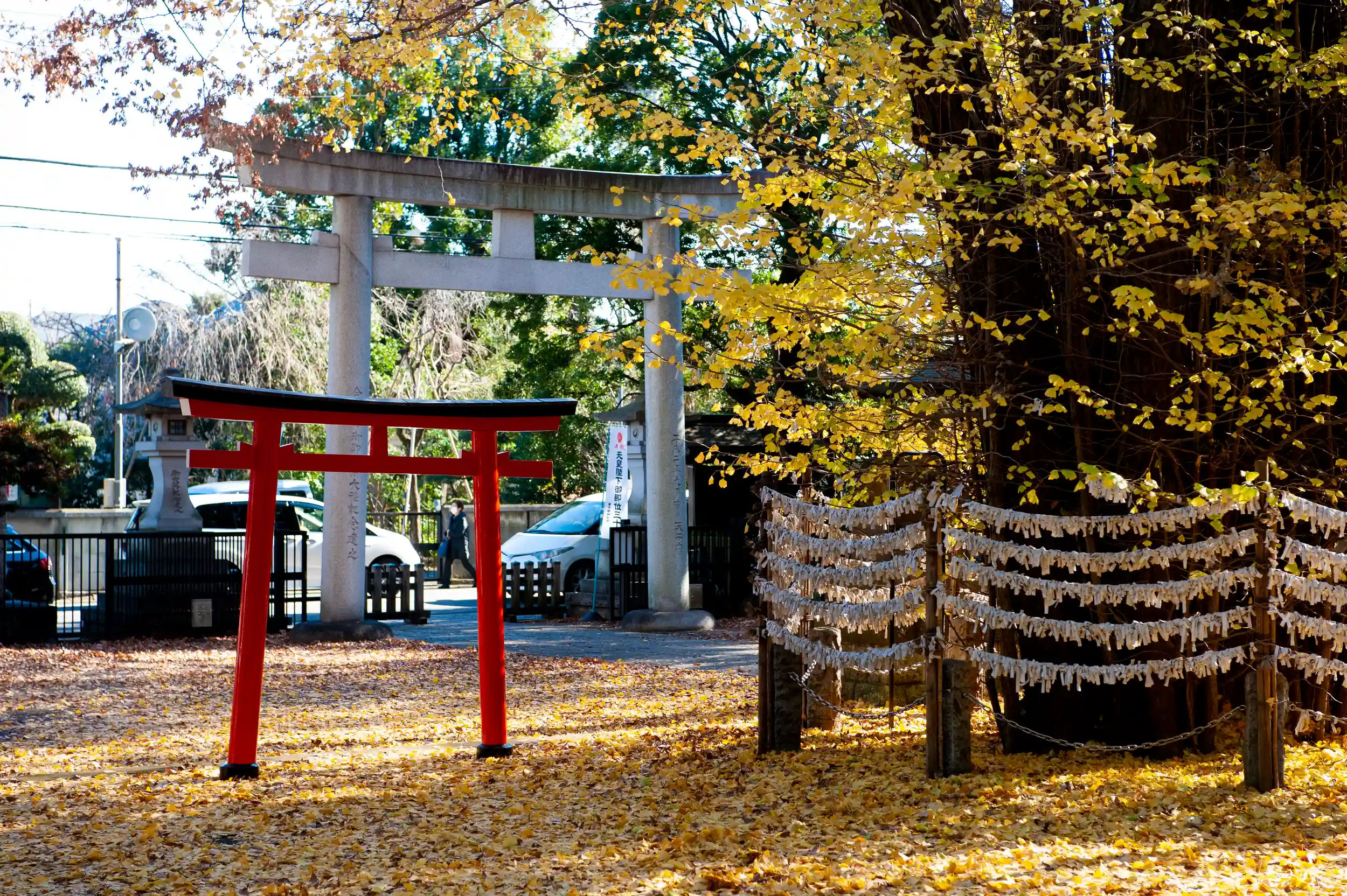 大國主命・事代主命はそれぞれ大黒様・恵比寿様とされ、商売繁盛の神として崇敬されています。こちらの神社は、拝殿・本殿ばかりではなくそれを取りまく境内社や富士塚を含め、とてもバランスのとれた空間配置と意匠に心打つものがあります。華美な装飾や精緻な彫刻こそありませんが、いい場所に千本銀杏がありとても癒される空間となっております。