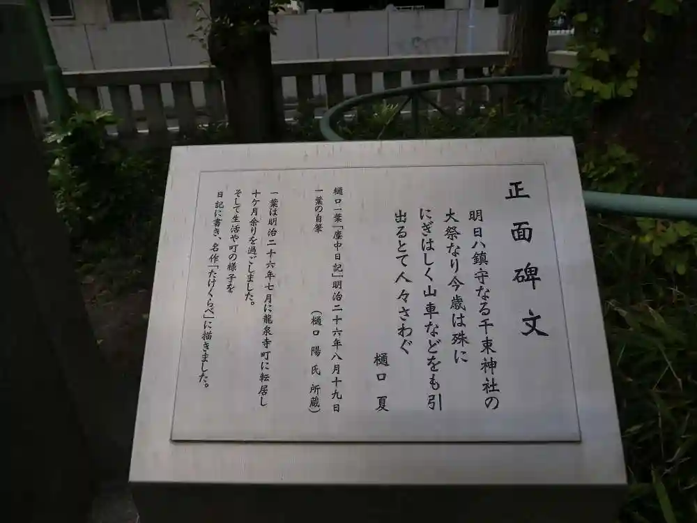 樋口一葉が一時期、この辺りに住んでいたことから、ゆかりの神社となっているそうです。胸像が境内にありました。