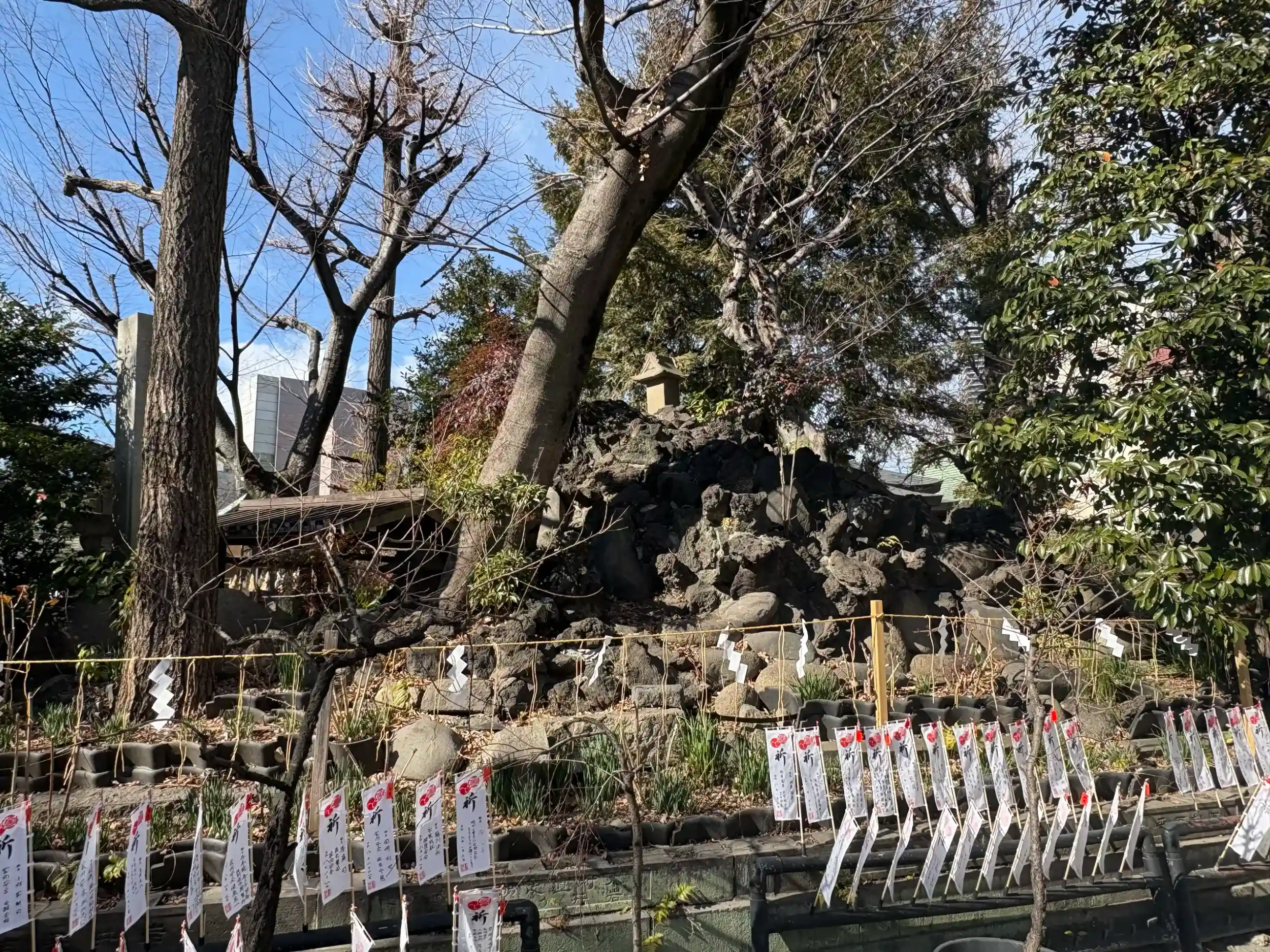 境内の富士塚の麓には瑞光石というご神体が拝めます。
