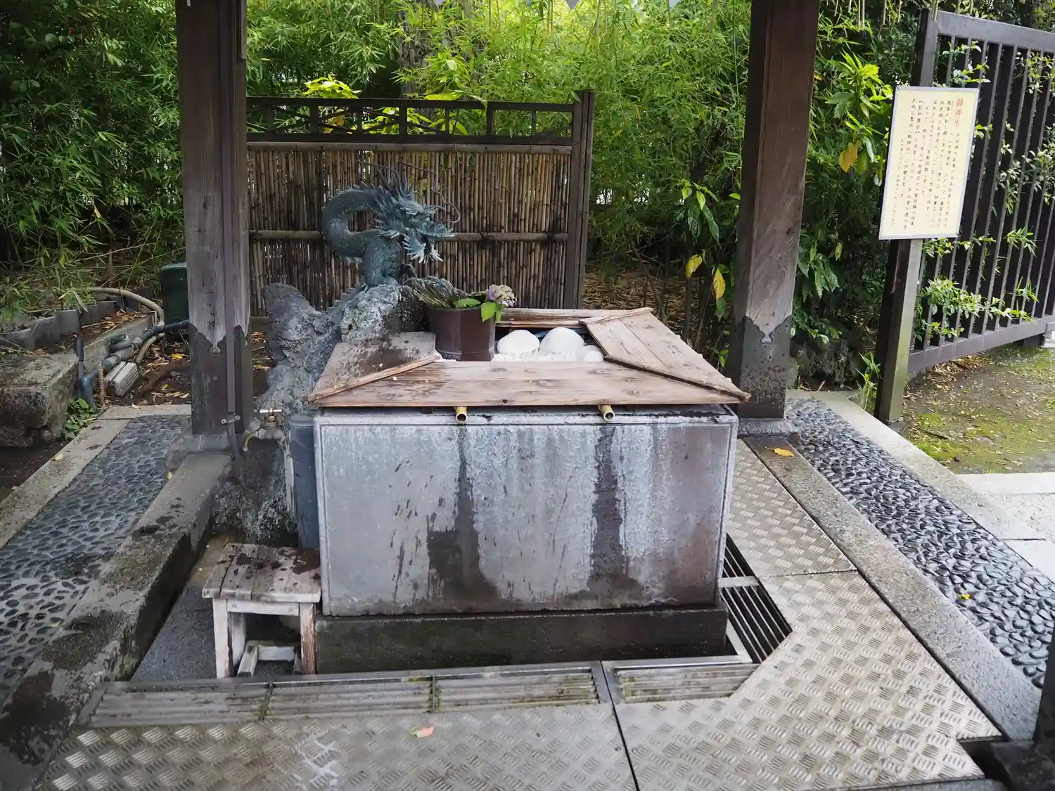 奥の細道矢立初めの句碑のあたりです。 隅田川を模した池にかかる小さな千住大橋を渡ってみました。 ここでも龍がお水を吐いています。あと6匹いれば生まれ変わった八岐大蛇みたいで楽しいな♪