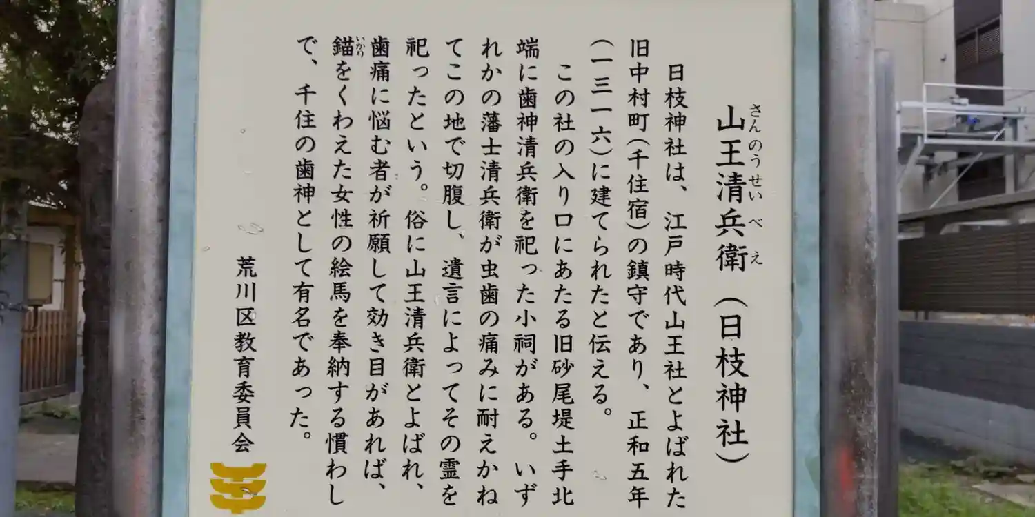 この社の入り口にあたる旧砂尾堤土手北端に歯神清兵衛を祀った小祠がある。いずれかの藩士清兵衛が虫歯の痛みに耐えかねてこの地で切腹し、遺言によってその霊を祀ったという。俗に山王清兵衛とよばれ、歯痛に悩む者が祈願して効き目があれば、錨をくわえた女性の絵馬を奉納する慣わしで、千住の歯神として有名であった。