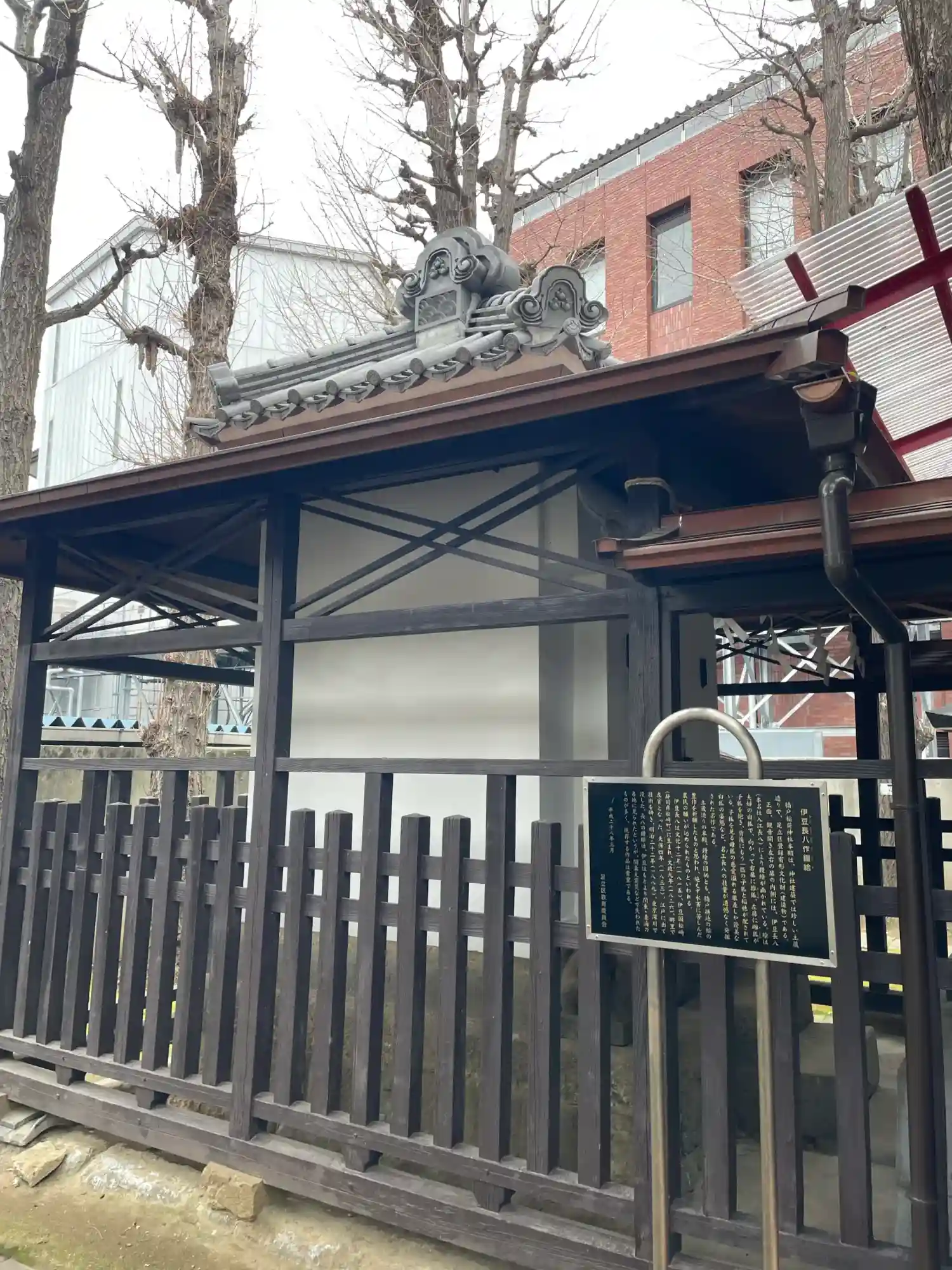 現在の本殿は安政6年(1859)に再建されたもので、内部には江戸時代の名工、伊豆長八による鏝絵が描かれています。観音開きの扉の内側に、雄狐・雌狐・子狐が稲穂と共に精緻に表現されています。この鏝絵は普段は非公開ですが、複製が境内に展示され、参拝者にもその魅力を伝えています。